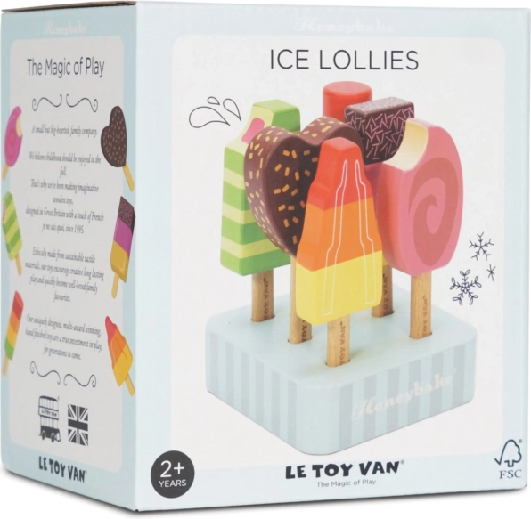 Kolorowy zestaw sześciu drewnianych lodów LE TOY VAN z kolekcji Honeybake zapewnia fantastyczną zabawę w odgrywanie ról i bezpieczną rozrywkę. Dzięki trwałemu drewnu FSC, nietoksyjnym farbom na bazie wody oraz dołączonemu stojakowi jest idealny do dziecięcych kuchni i stoisk z lodami. Wspiera motorykę małą, kreatywność i umiejętności poznawcze.