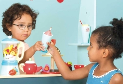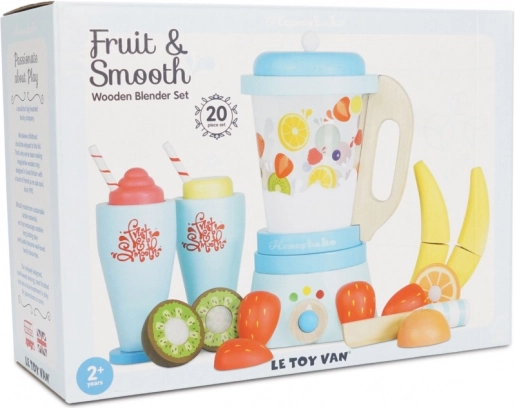 Zaserwuj dzieciom zdrową porcję zabawy z drewnianym mikserem do smoothie LE TOY VAN. Zestaw zawiera klasyczny mikser z odłączanym dzbankiem, 6 sztuk owoców do krojenia na rzep, drewniany nożyk oraz 2 szklanki ze słomkami. Wykonany z drewna z certyfikatem FSC, ręcznie domalowany nietoksycznymi farbami na bazie wody i nagrodzony za jakość oraz walory zabawowe.