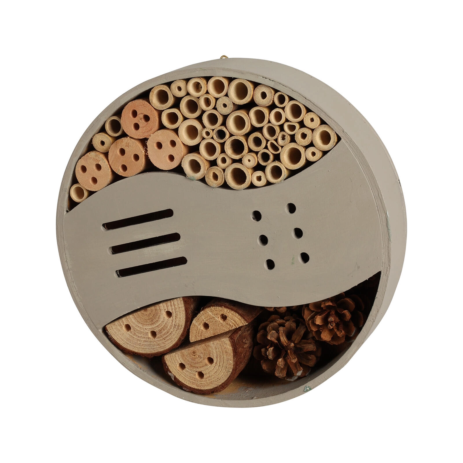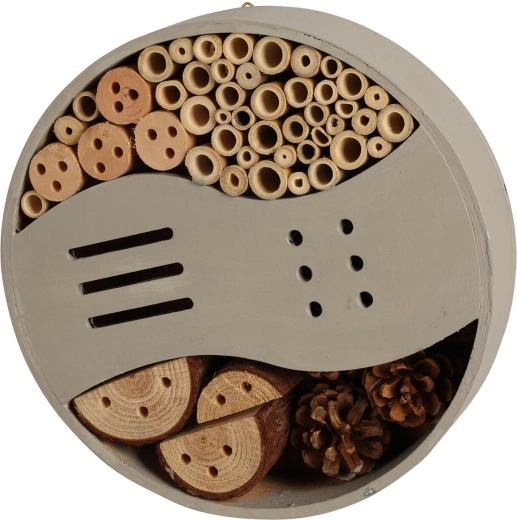 Design w połączeniu kolorów szarego i zielonego łatwo wkomponowuje się w przestrzeń zewnętrzną. Umieść go w nasłonecznionym, osłoniętym od wiatru miejscu, na wysokości co najmniej 1–2 metrów nad ziemią, aby zapewnić owadom spokojne schronienie przez cały rok.