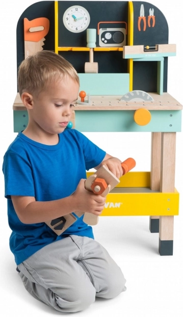 Dziecięcy drewniany warsztat ALEX od LE TOY VAN oferuje wszystko, czego mali naprawiacze potrzebują do realistycznej zabawy. Dzięki solidnemu wykonaniu z certyfikowanego drewna FSC oraz nietoksycznym farbom jest bezpieczny, trwały i przyjazny dla środowiska. W zestawie znajduje się wbudowana piła tarczowa, miarka i imadło, górna półka z haczykami oraz dolna przestrzeń na dodatkowe wyposażenie.