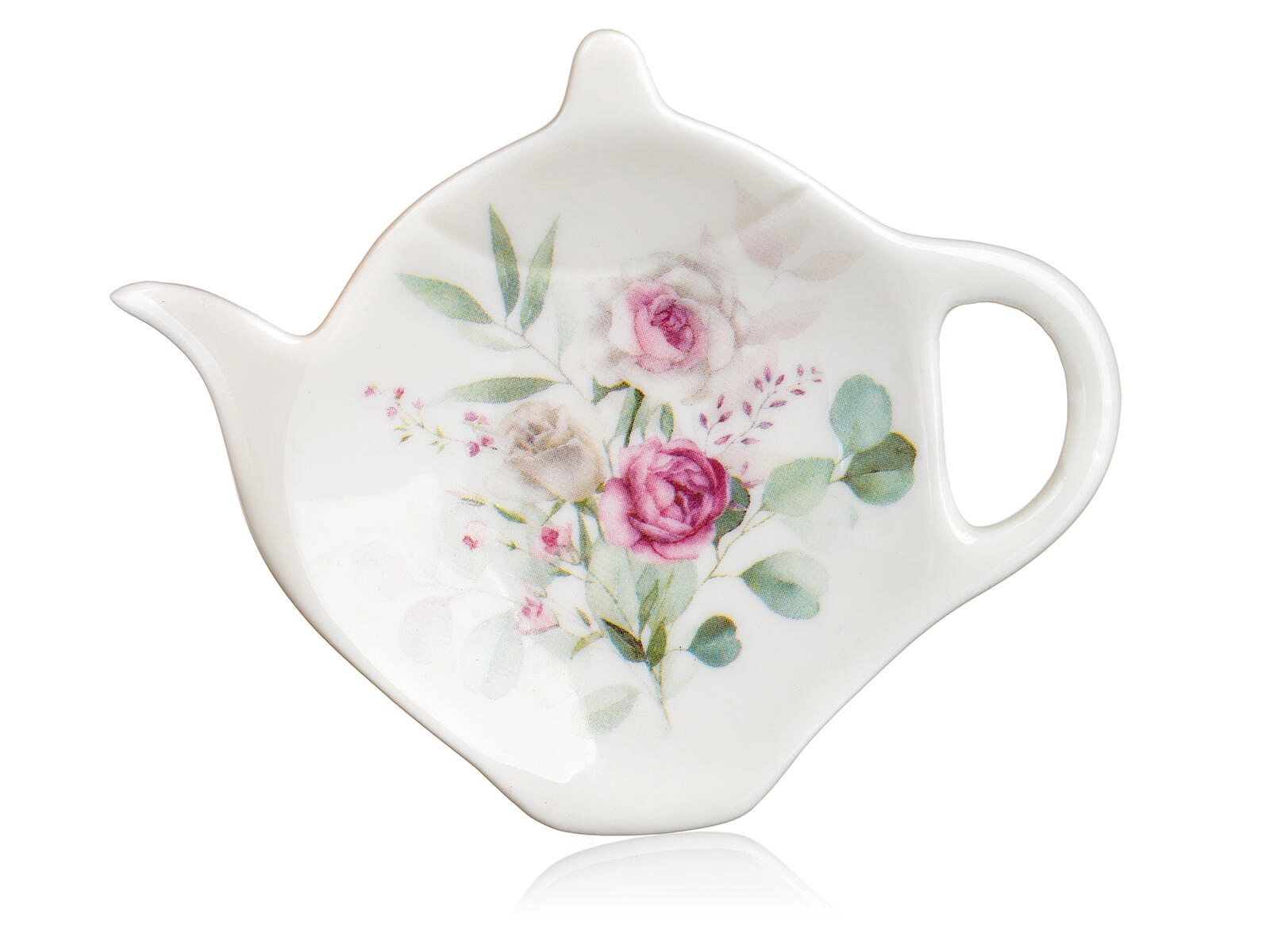 Praktyczny mały spodek w kształcie czajniczka służy do odłożenia sitka po zaparzaniu. Utrzymuje blat w czystości i współgra z kwiatowym dekorem kubka.