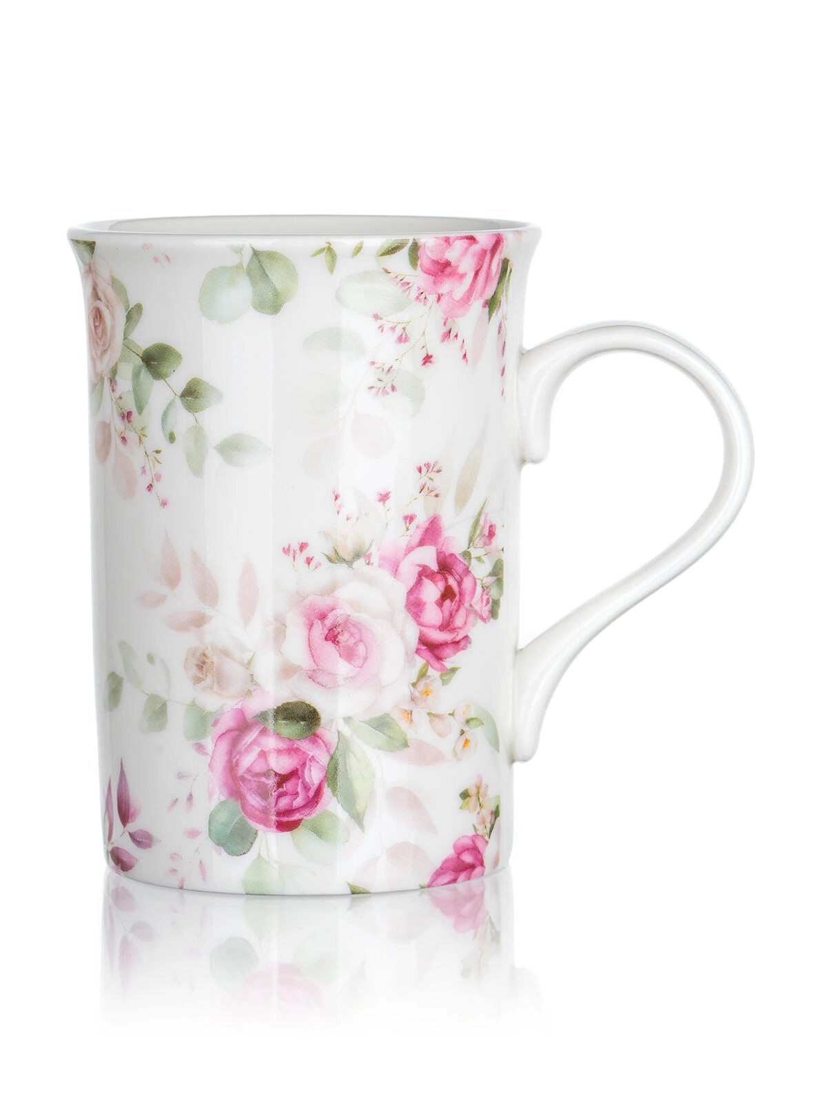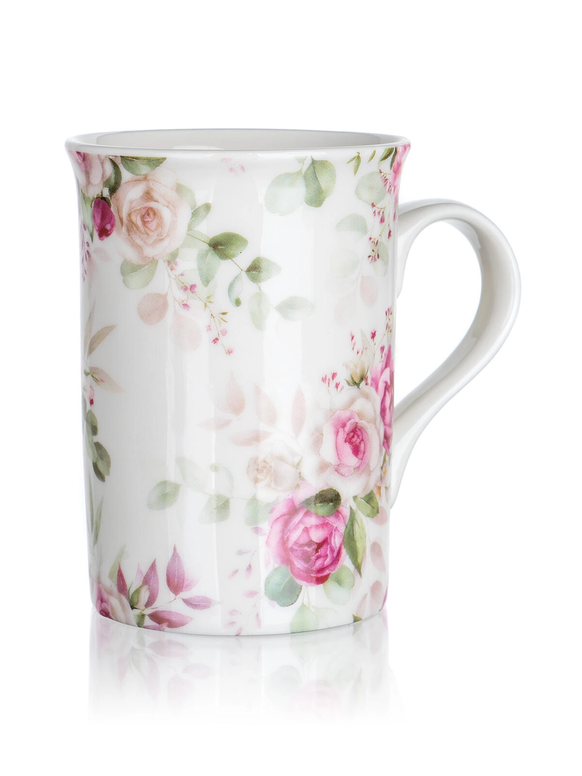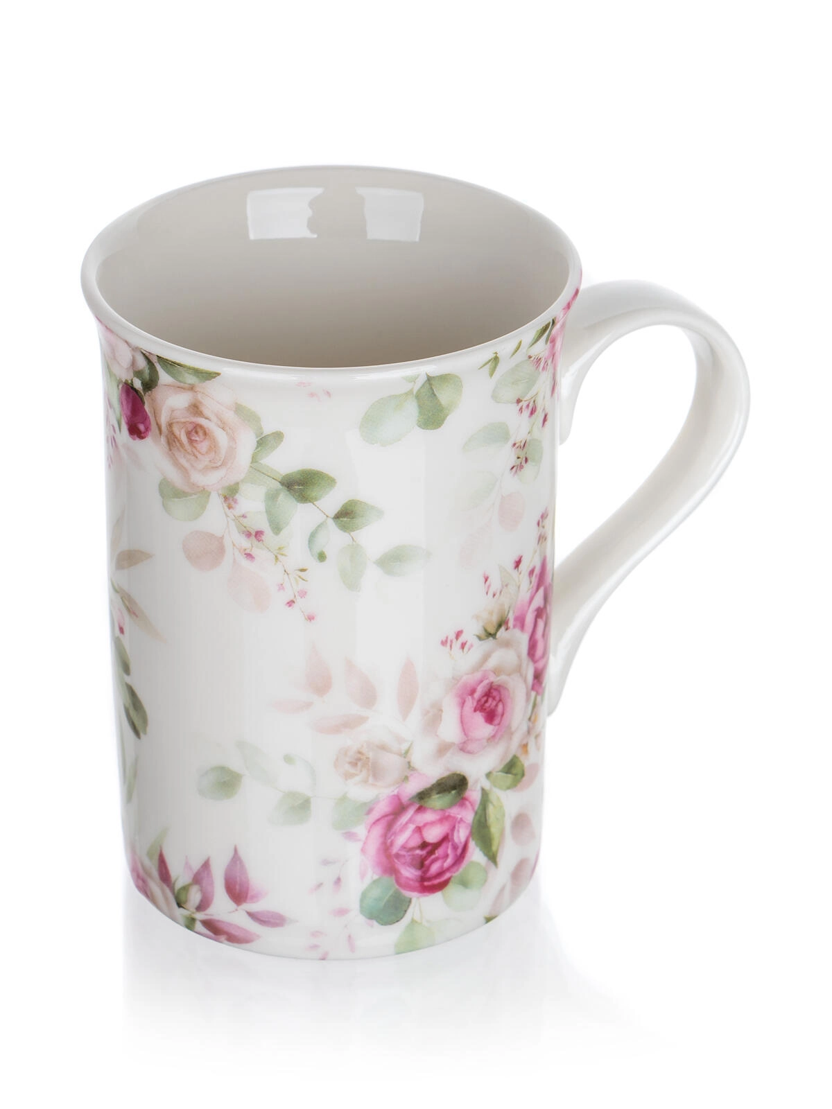 Pojemny ceramiczny kubek z wygodnym uchem i kwiatowym motywem róż idealnie nadaje się do herbaty i kawy. Utrzymuje napój przyjemnie ciepły i świetnie leży w dłoni.