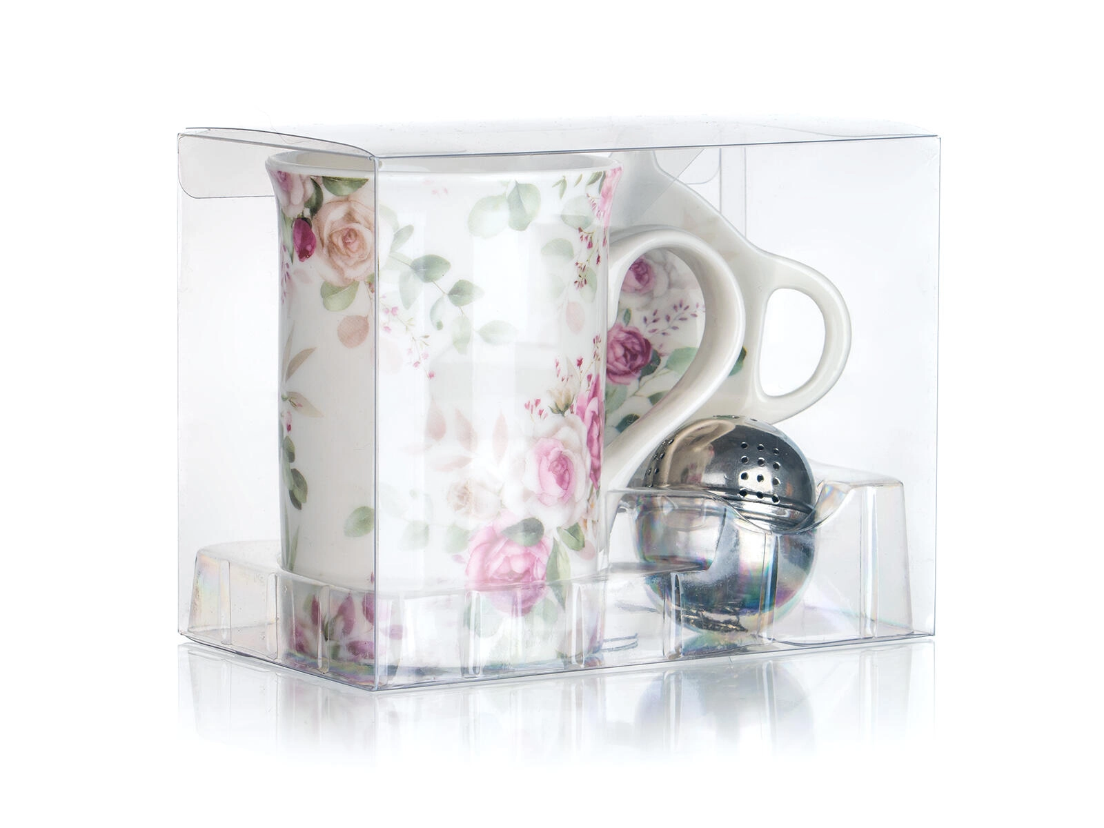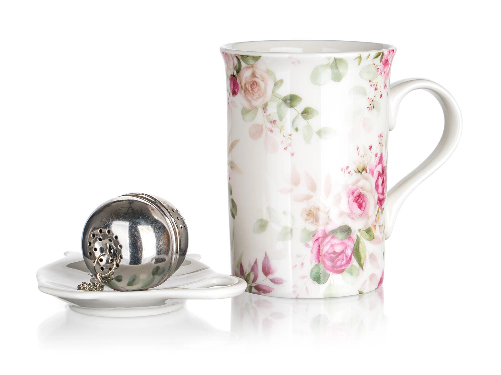Ten romantyczny zestaw do herbaty z motywem róż wniesie do Twoich przerw na herbatę szyk i wygodę. Pojemny kubek o objętości 340 ml jest idealny na poranną herbatę lub popołudniową kawę, sitko ze stali nierdzewnej zapewnia klarowny napar z mieszanek liściastych, a ceramiczny spodek chroni stół przed kroplami.