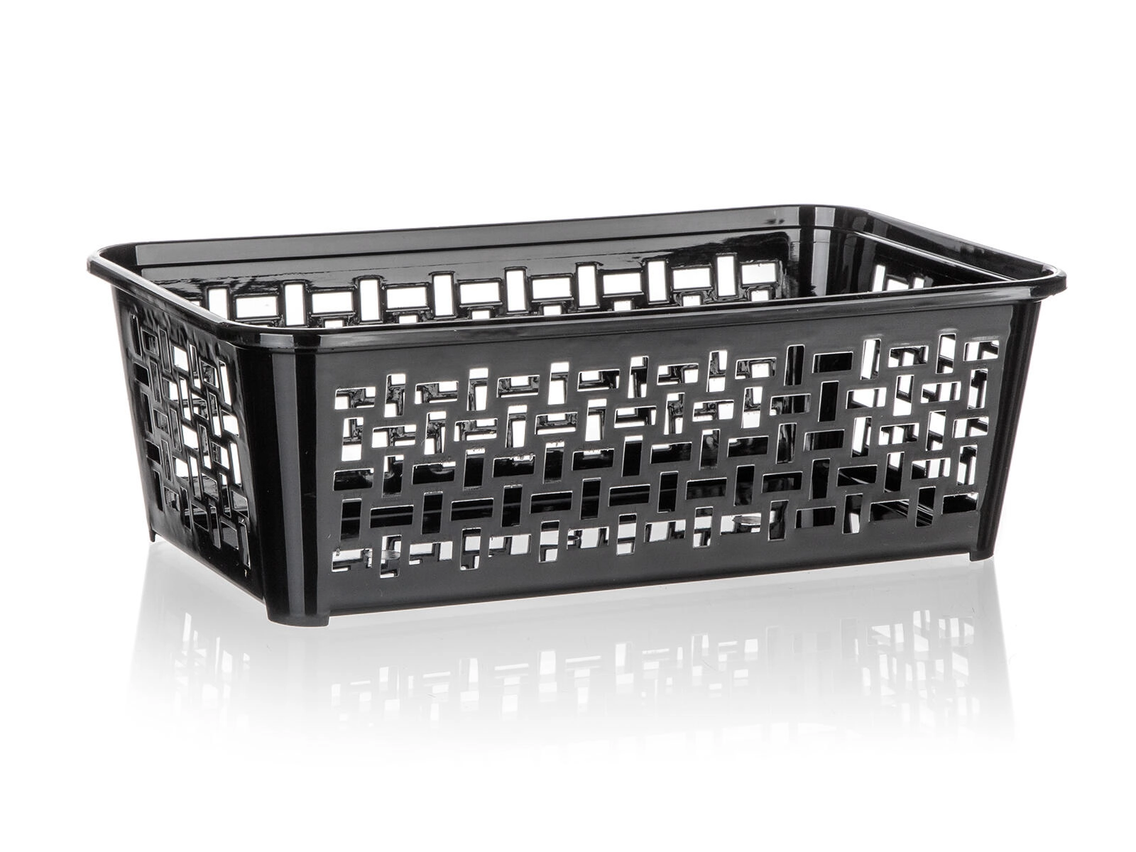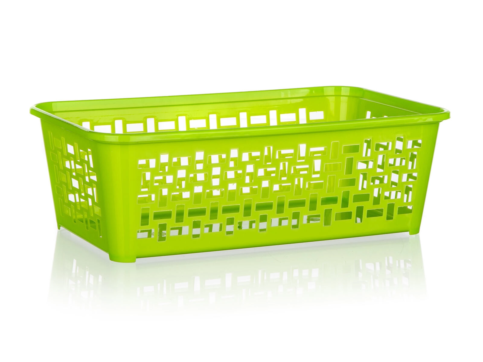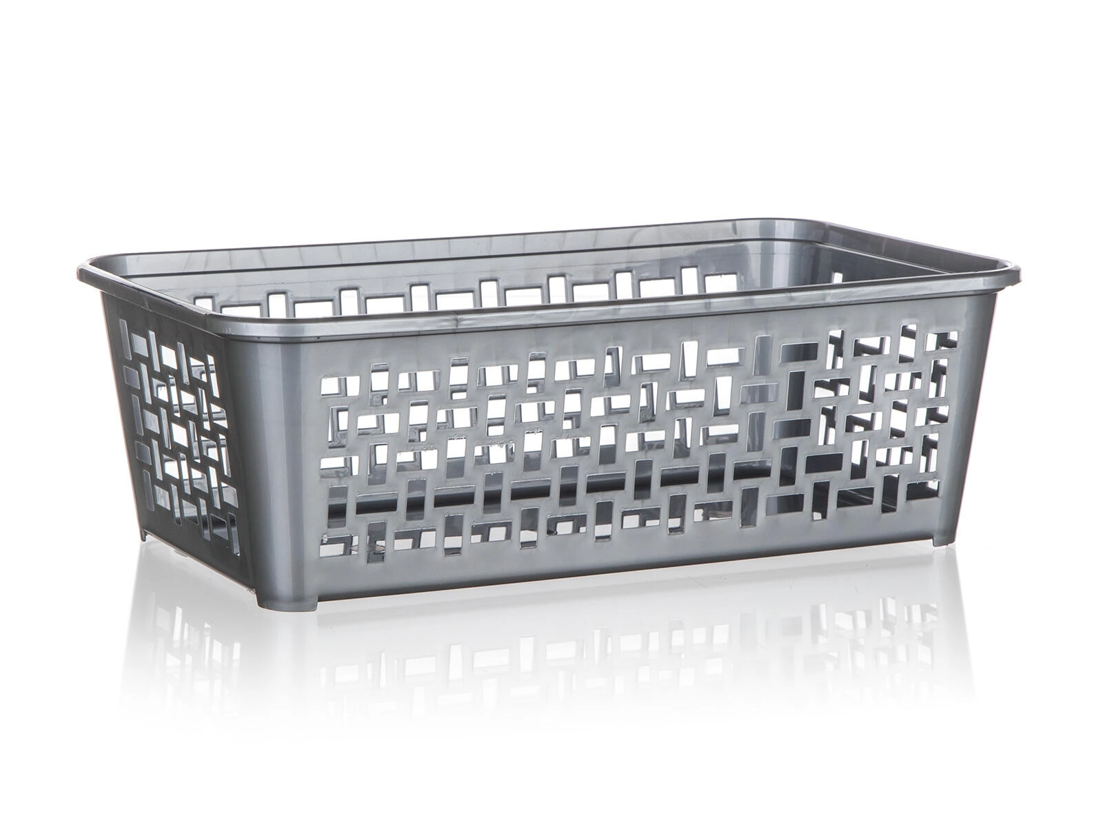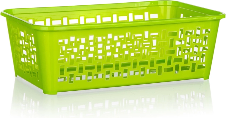 Praktyczny plastikowy koszyk o wymiarach 24,7 × 14,7 × 8 cm pomoże utrzymać porządek w łazience, kuchni i biurze. Dzięki perforowanym ściankom zawartość jest zawsze dobrze widoczna i przewiewna. Koszyk można włożyć poprzecznie do większego koszyka 35,8 × 25,6 cm, tworząc międzypoziom, który oszczędza miejsce. Dostępny w mixie kolorów dla łatwego dopasowania do wnętrza.
