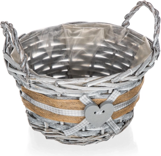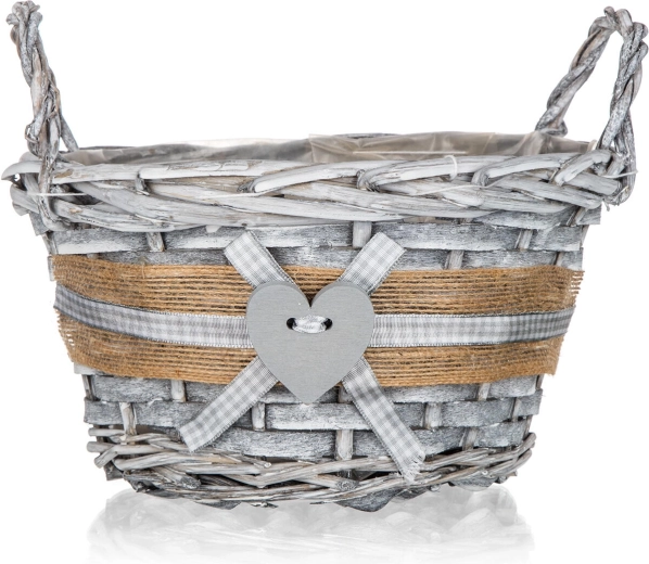 Koszyk wykonany jest z wytrzymałej wikliny i uzupełniony jutowym brzegiem, kraciastą wstążką oraz drewnianym sercem, które podkreślają jego rustykalny charakter. Dwa solidne uchwyty umożliwiają wygodne przenoszenie i łatwą manipulację podczas sprzątania lub wymiany wypełnienia.