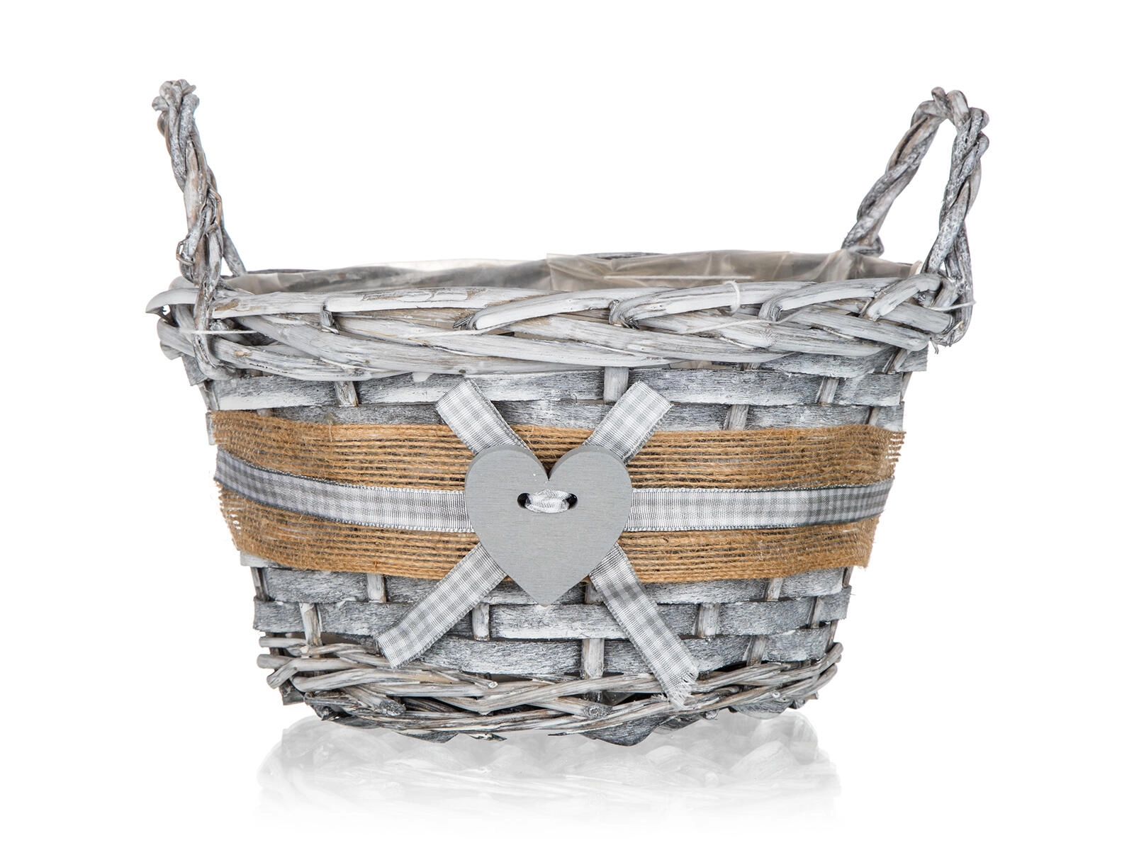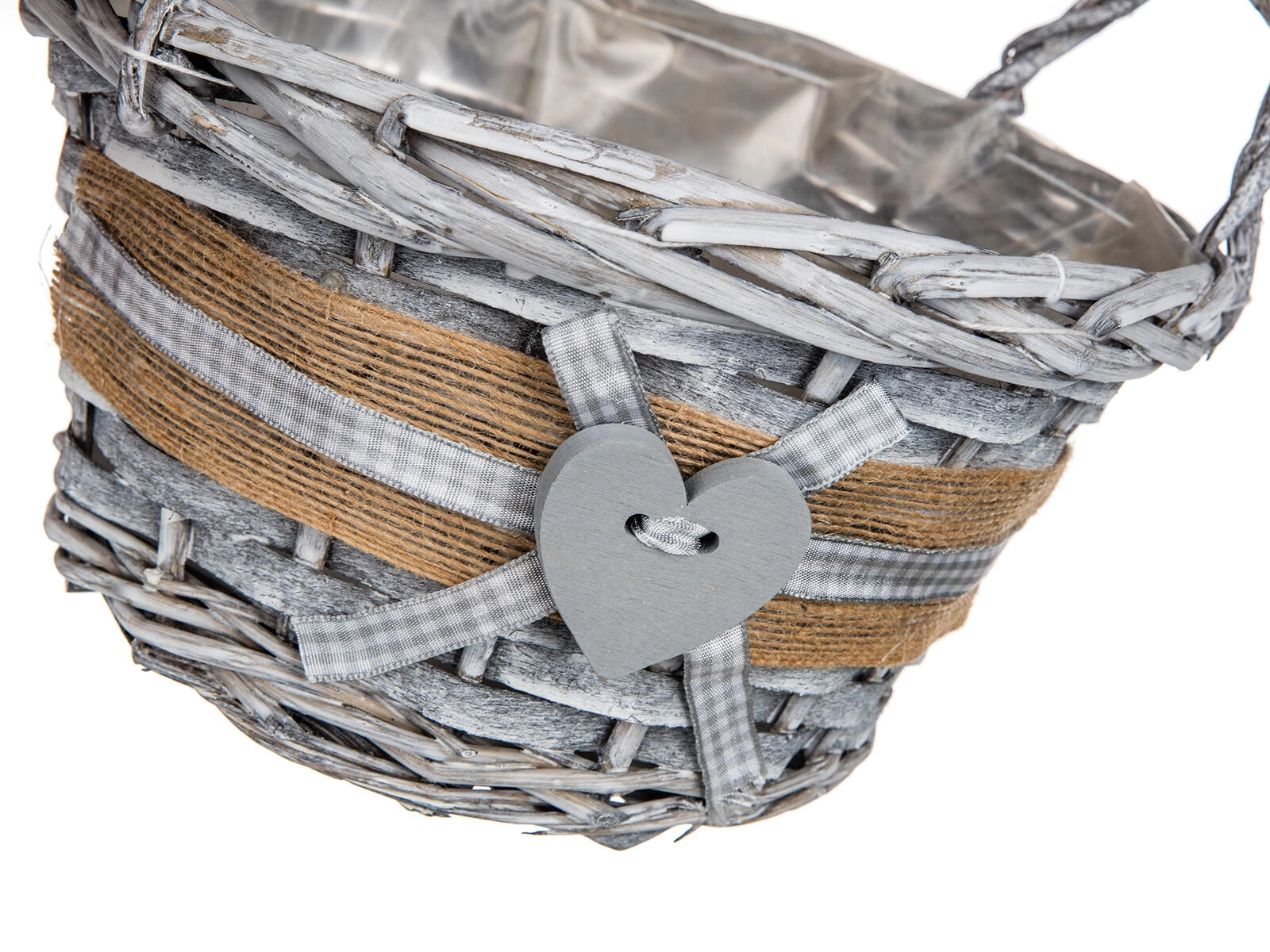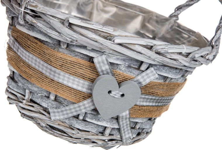 Jutowy brzeg, kraciasta wstążka i drewniane serce nadają koszykowi romantyczny, wiejski wygląd pasujący do każdego wnętrza.