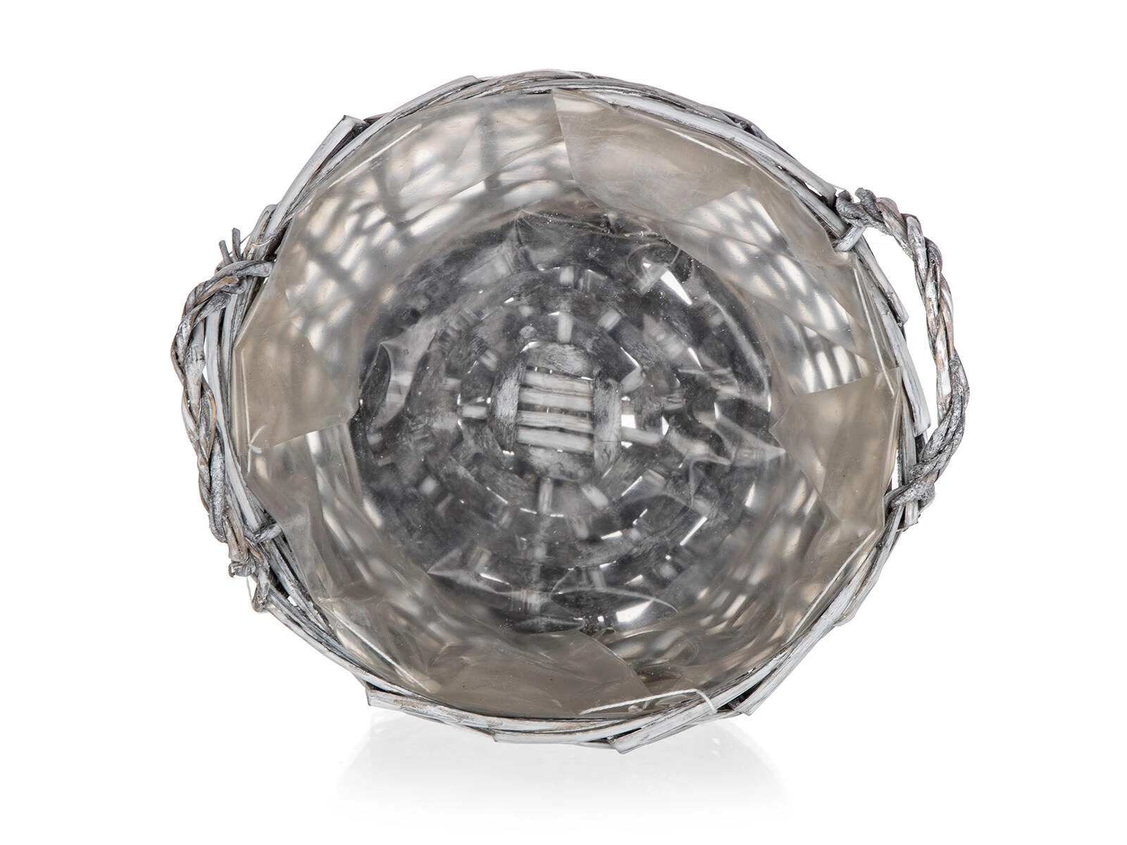 Włożona folia/plastik chroni wiklinę przed wilgocią i pozwala bezpiecznie używać koszyka jako osłonki na kwiaty lub do wilgotnych aranżacji.