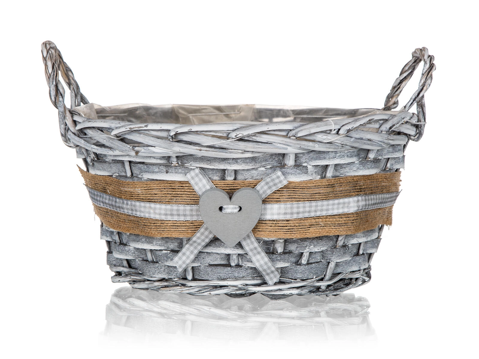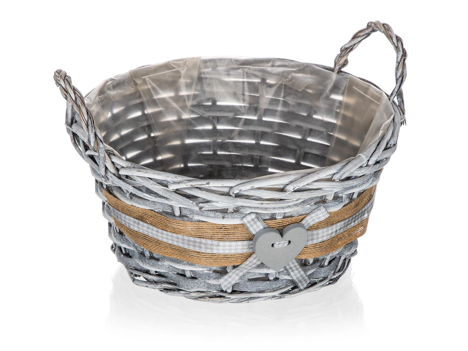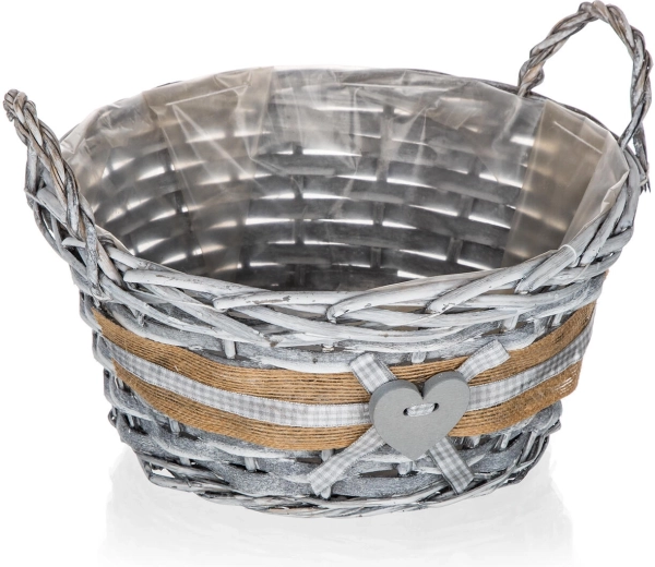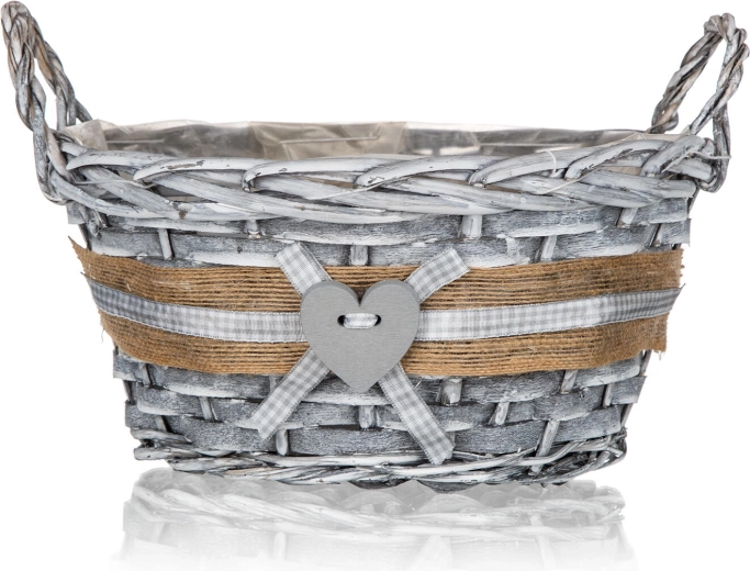Szara wiklina z jutowym paskiem, kraciastą kokardką i serduszkiem nadaje koszykowi oryginalny wygląd, który doskonale uzupełni zarówno nowoczesny, jak i wiejski styl.
