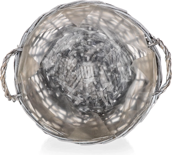 Ten okrągły wiklinowy koszyk GRIS zachwyca szarym wykończeniem „whitewash”, ozdobną jutową taśmą z kraciastą kokardką i serduszkiem. Praktyczna plastikowa wkładka chroni powierzchnie przed wilgocią, dzięki czemu świetnie sprawdzi się jako dekoracyjna osłonka na rośliny lub elegancki kosz do przechowywania w salonie, kuchni czy przedpokoju.