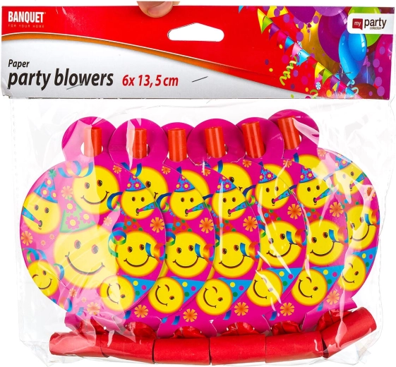 Każde opakowanie zawiera 6 sztuk z wyrazistymi nadrukami (uśmiechy, baloniki, napis „Happy Birthday”), więc bez trudu kolorystycznie dopasujesz dekoracje i zdjęcia z imprezy. Trąbki nadają się do użytku w pomieszczeniach i na zewnątrz i są popularnym dodatkiem na rodzinne oraz dziecięce przyjęcia.
