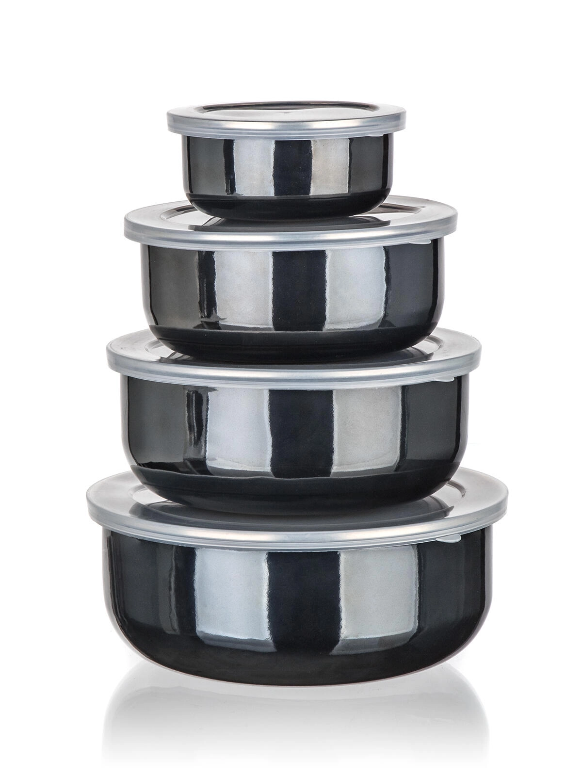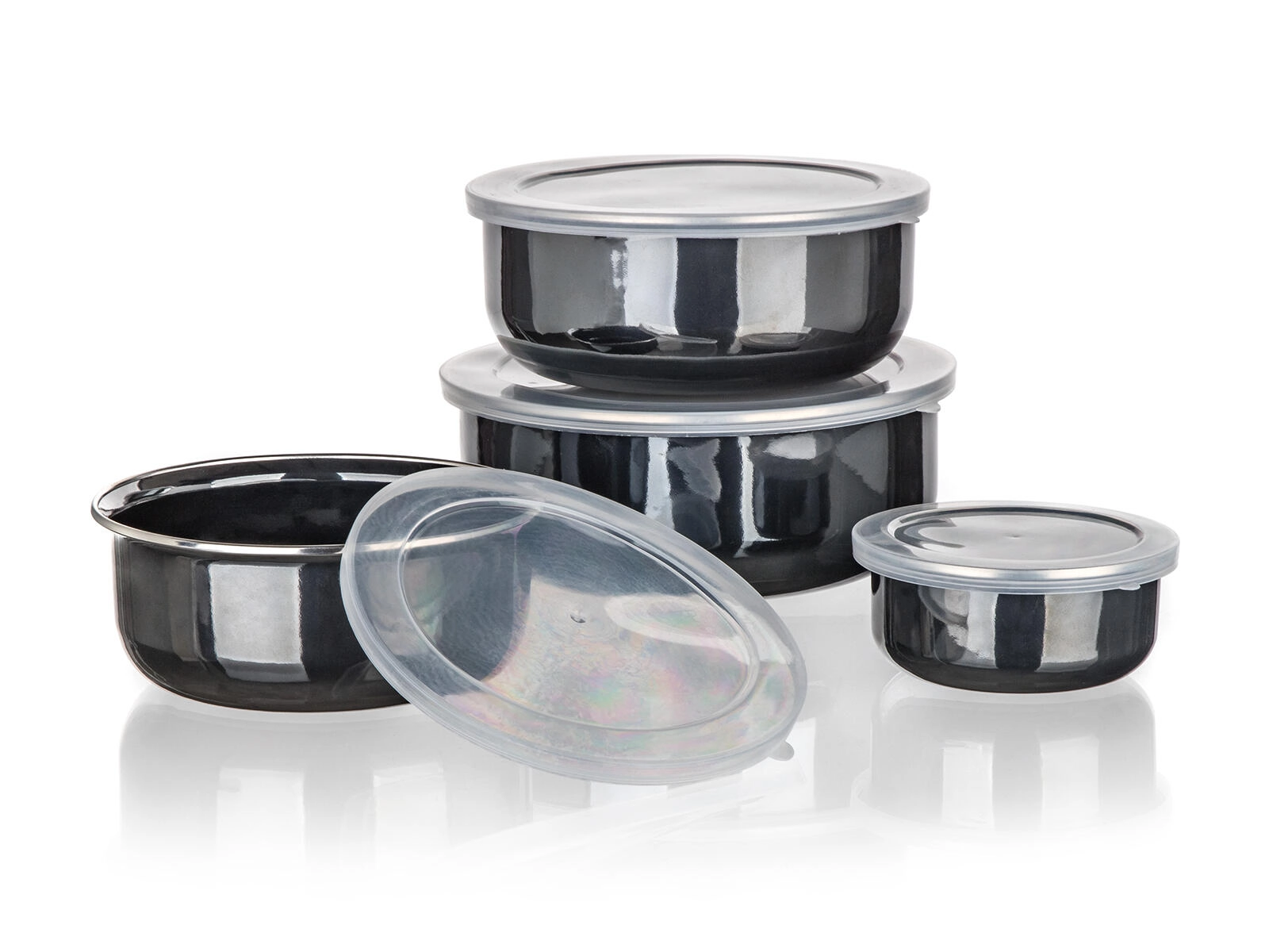 Praktyczny zestaw emaliowanych misek z plastikowymi pokrywkami METALIC Black w eleganckim czarnym kolorze do codziennego użytku. Cztery rozmiary z możliwością wkładania jedna w drugą oszczędzają miejsce, uszczelniające pokrywki pomagają dłużej zachować świeżość żywności, a wytrzymała emalia zapewnia łatwą pielęgnację. Idealne do przechowywania żywności w lodówce i w podróży.