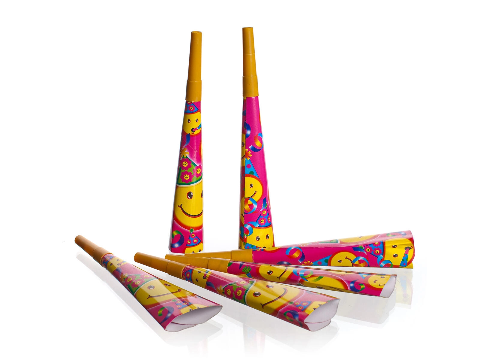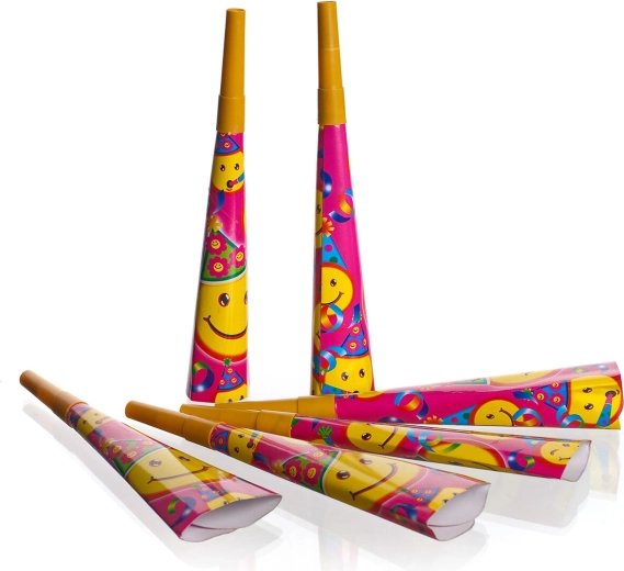 Stwórz prawdziwą imprezową atmosferę w kilka sekund. Te lekkie i bezpieczne trąbki z plastikowym ustnikiem są wygodne w użyciu, a dzięki barwnym motywom staną się także stylową ozdobą stołu.
