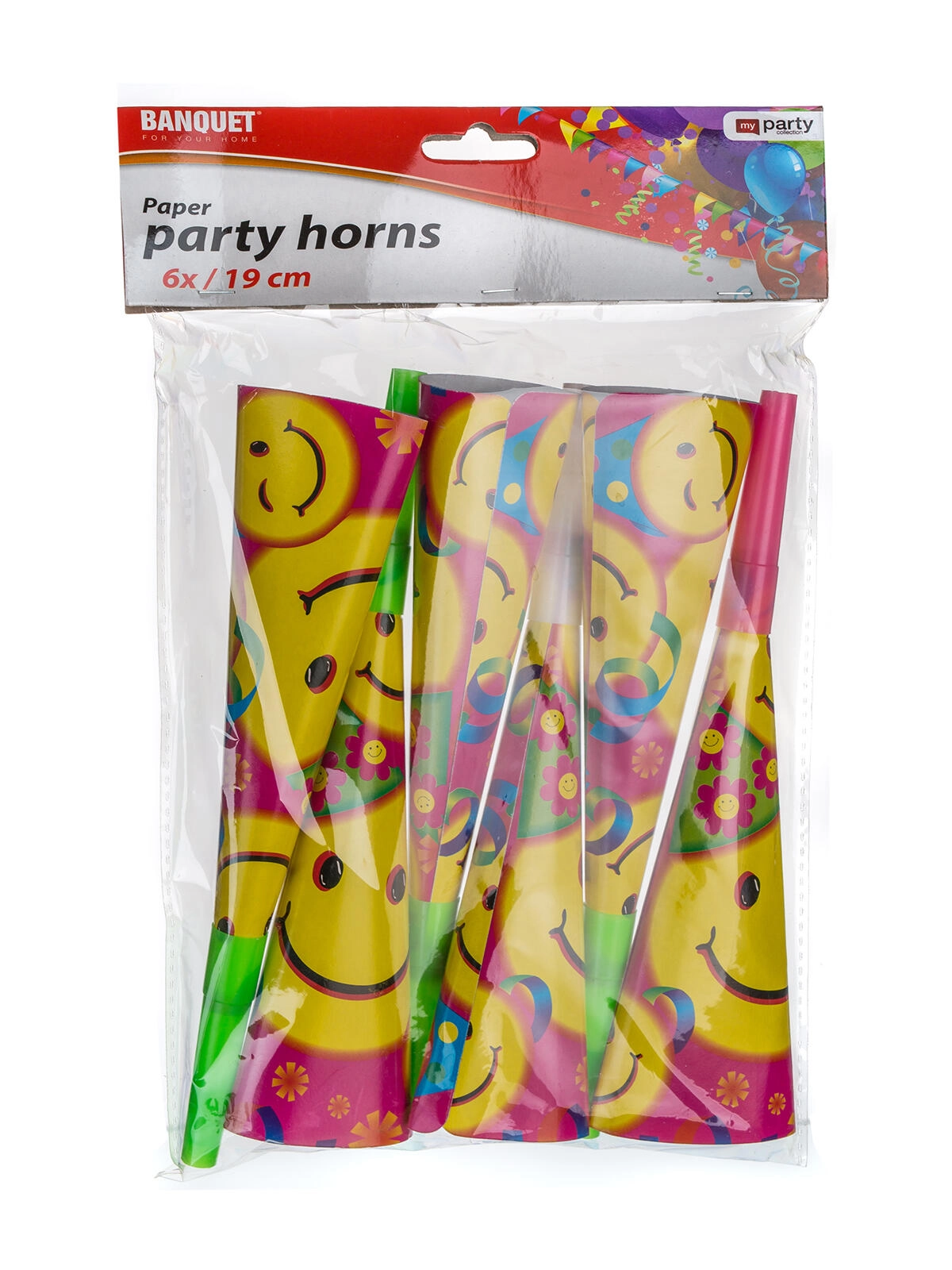 Rozkręć każdą imprezę z wesołymi papierowymi trąbkami MY PARTY o długości 19 cm. W opakowaniu znajdziesz 6 sztuk z kolorowymi nadrukami i plastikowym ustnikiem dla łatwego dmuchania. Idealne na urodziny, imieniny, Sylwestra i karnawał.