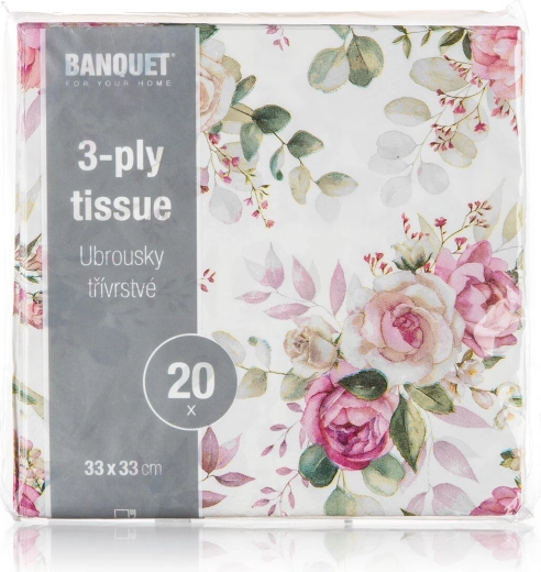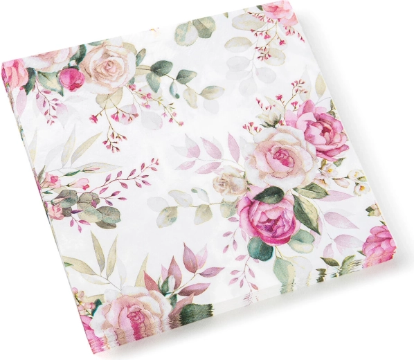 Eleganckie papierowe serwetki z romantycznym motywem róż ozdobią każdy stół. Są 3-warstwowe dla lepszej chłonności i wytrzymałości, mają praktyczny wymiar 33 × 33 cm, a opakowanie 20 szt. świetnie sprawdzi się na przyjęcia, wesela i codzienne posiłki.