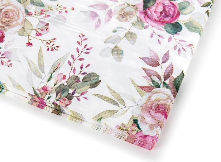 Dodaj szyku swojemu stołowi dzięki dekoracyjnym serwetkom z subtelnym kwiatowym motywem. Wysokiej jakości, trójwarstwowe wykonanie gwarantuje doskonałą chłonność i wytrzymałość, więc bez problemu poradzą sobie z drobnymi wpadkami i uroczystym toastem.