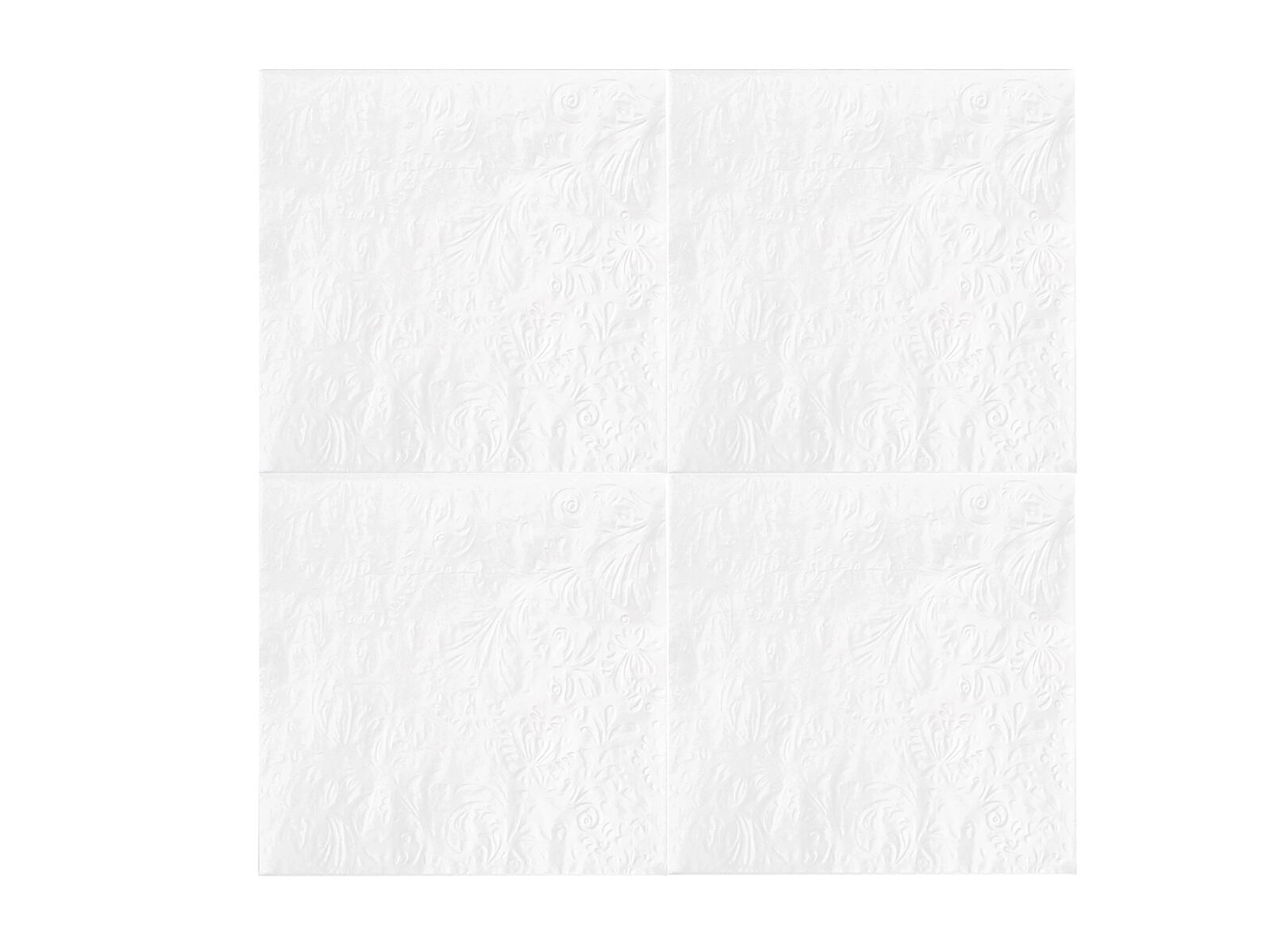 Te białe serwetki z dyskretnym tłoczeniem są idealne na odświętne stoły, rodzinne przyjęcia i codzienne posiłki. Dzięki trzem warstwom są przyjemnie miękkie, a jednocześnie mocne i dobrze chłonne. Uniwersalny rozmiar 33 × 33 cm zapewnia wygodę użytkowania w domu, w szkole i w podróży.