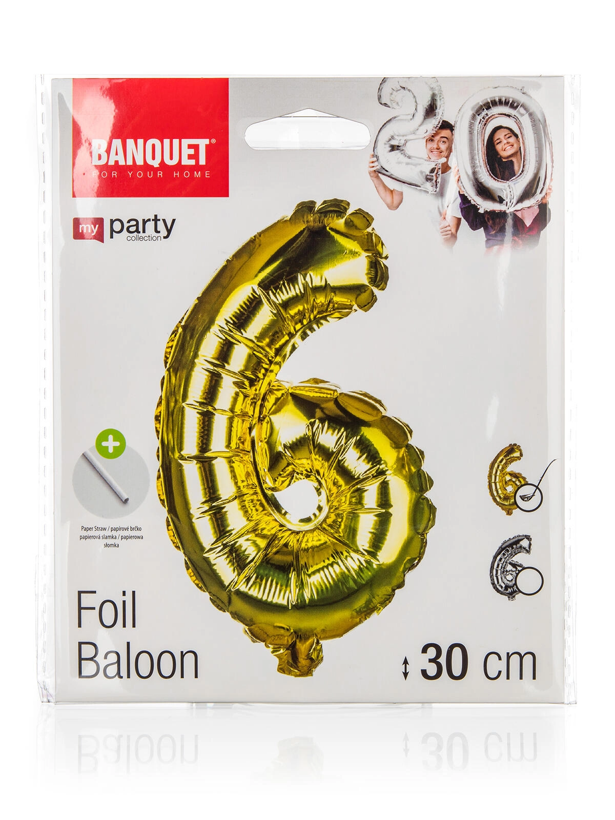 Stylowy balon foliowy w kształcie cyfry 6 o wysokości ok. 30 cm w eleganckim miksie kolorów złoty i srebrny. W zestawie znajduje się papierowa słomka do łatwego dmuchania oraz sznurek do zawieszenia. Idealna dekoracja na urodziny, rocznice i przyjęcia, można napełnić powietrzem.