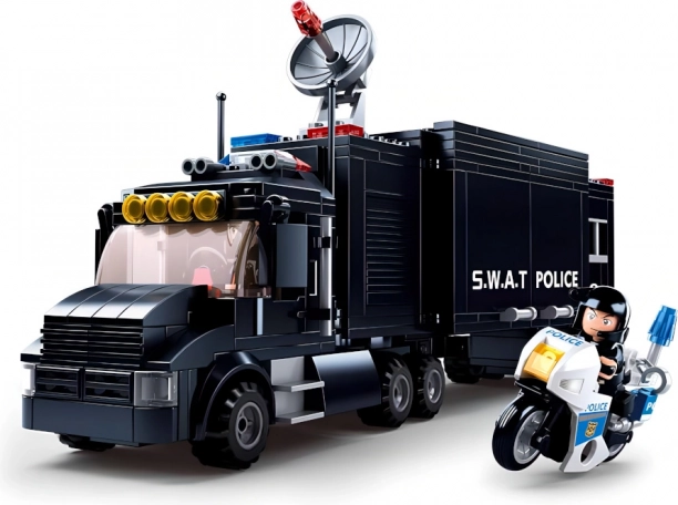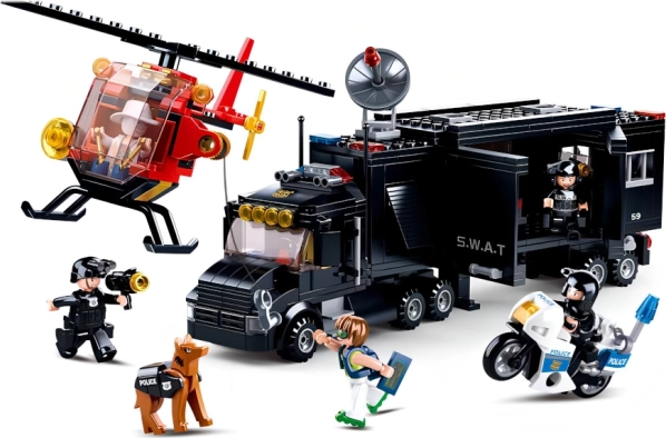 Dominantą zestawu jest czarna ciężarówka SWAT – mobilna baza z realistycznymi detalami, która służy jako centrala wszystkich policyjnych akcji. Idealna do taktycznych przemieszczeń i planowania akcji.