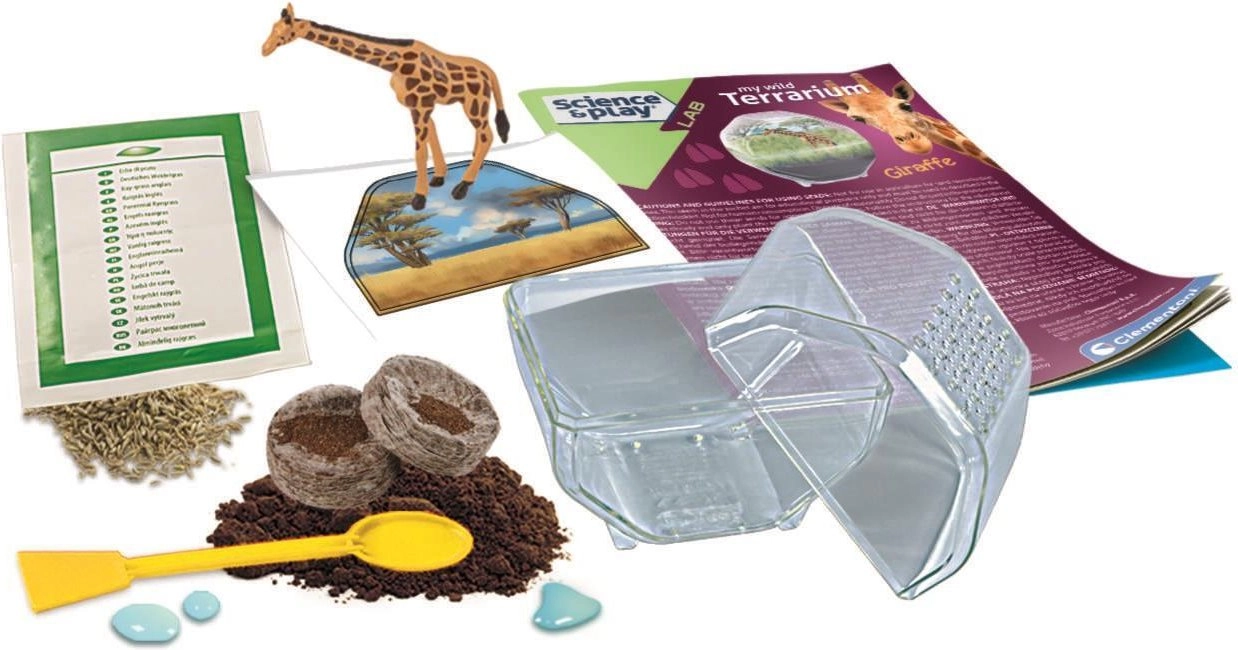 - Przezroczyste terrarium z wentylowaną pokrywką, pelety glebowe, nasiona, łopatka, figurka żyrafy, dekoracyjne tło, instrukcja