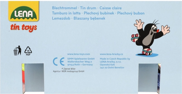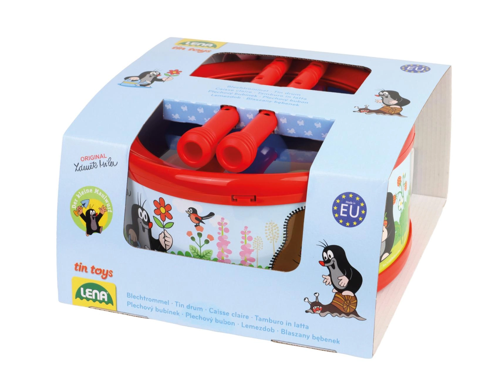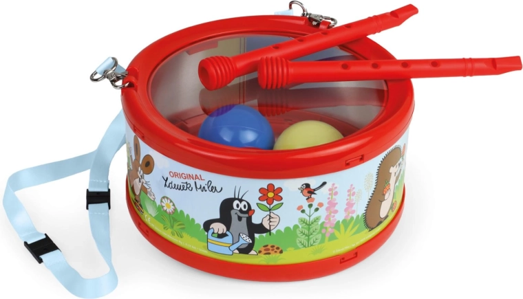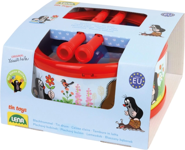 Dziecięcy blaszany bębenek z ulubionym motywem KRECIKA ucieszy małych muzyków. W zestawie są pałeczki, których można używać także jak fletów, a wewnątrz bębenka znajdują się baloniki dla zabawniejszego efektu dźwiękowego.