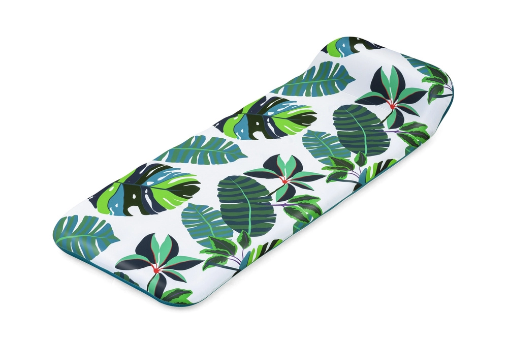 Stylowa i praktyczna nadmuchiwana mata z tropikalnym nadrukiem zamieni każdy dzień nad wodą w doskonały relaks. Zintegrowane podwyższenie w okolicy głowy zapewnia przyjemne wsparcie, a wysokiej jakości materiał PVC gwarantuje długą żywotność i odporność.