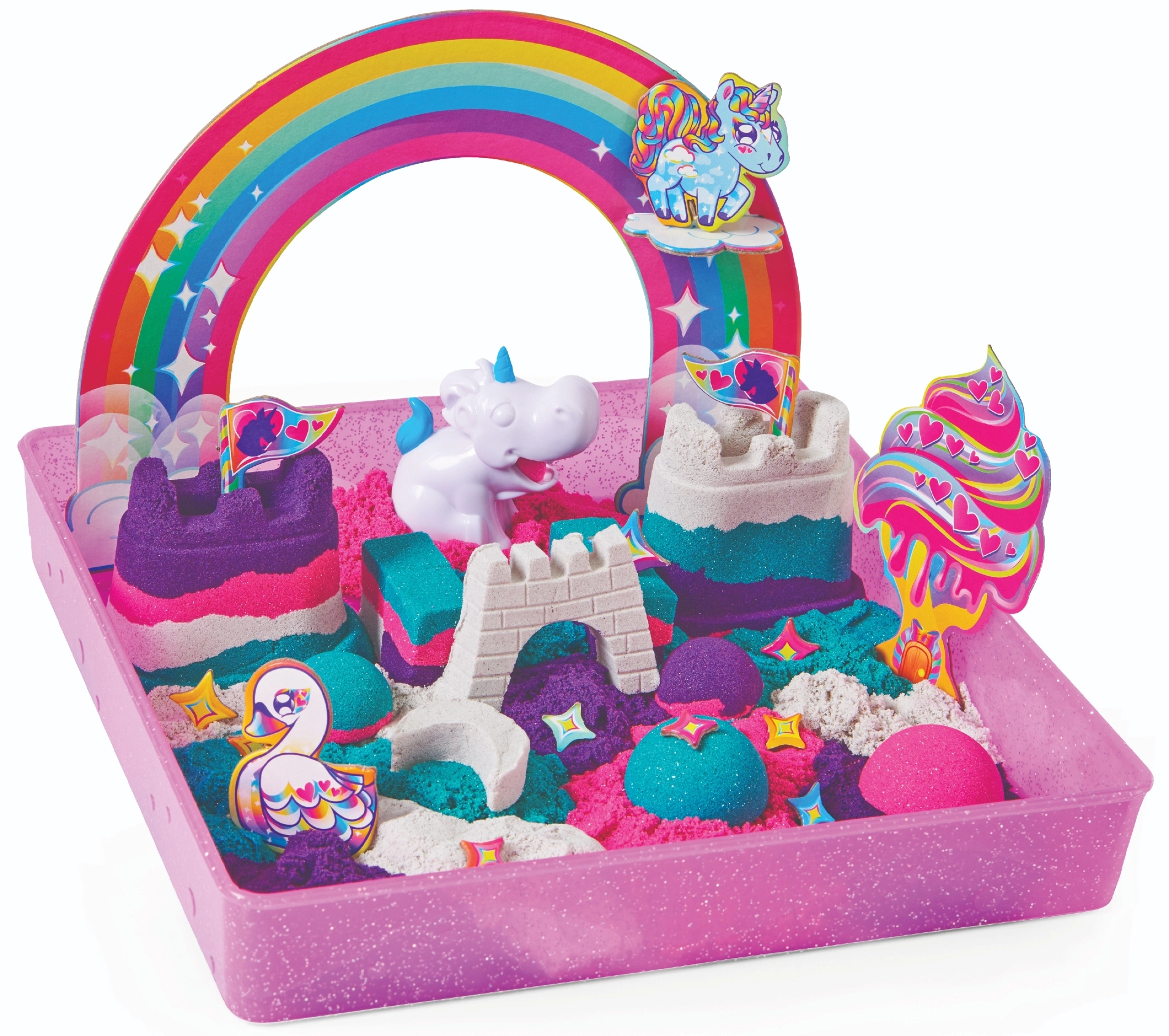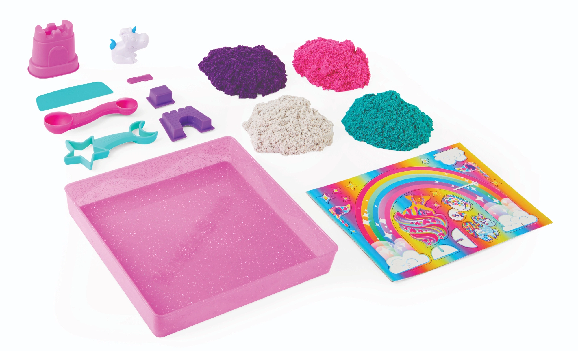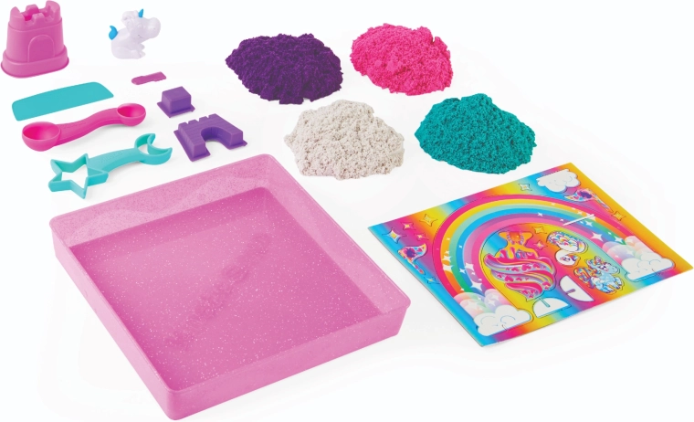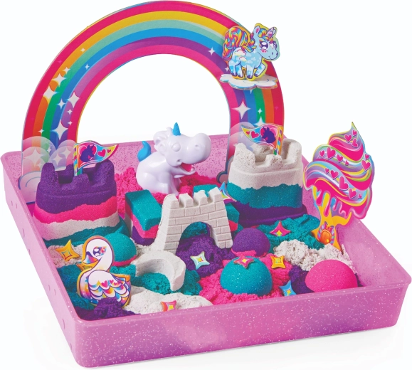 Wejdź do baśniowego świata jednorożców i zbuduj własne królestwo z kinetycznego piasku. W opakowaniu znajdziesz około 0,9 kg piasku w czterech kolorach – fioletowym, różowym, turkusowym i białym – z subtelnym połyskiem, który nada każdej pracy magiczny wygląd.