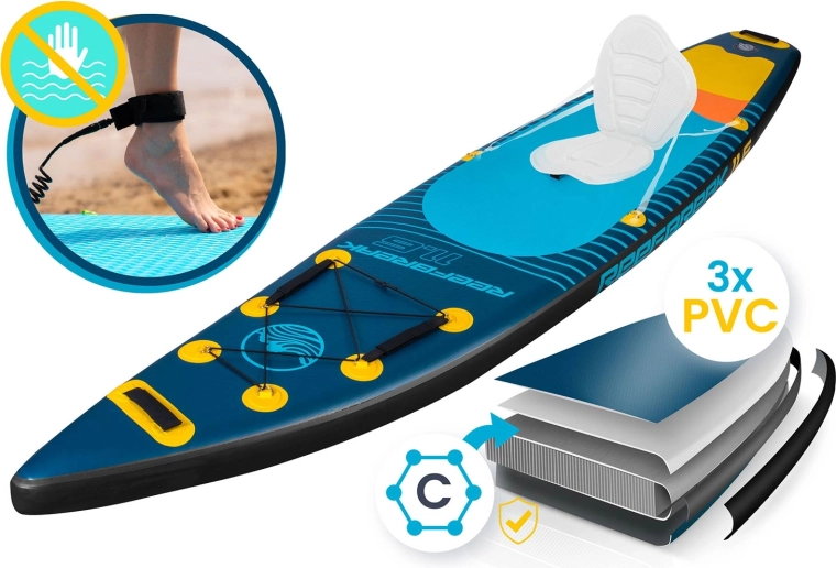 Praktyczne wyposażenie obejmuje przednie elastyczne bungee do mocowania plecaka lub napoju, centralny uchwyt i liczne uchwyty nośne dla łatwego przenoszenia. Regulowane wiosło 162–210 cm szybko blokuje się zamkiem dźwigniowym, a dwustopniowa pompka z manometrem przyspiesza przygotowanie do pływania. Leash z obrotowym przegubem zapewnia bezpieczeństwo bez plątania.