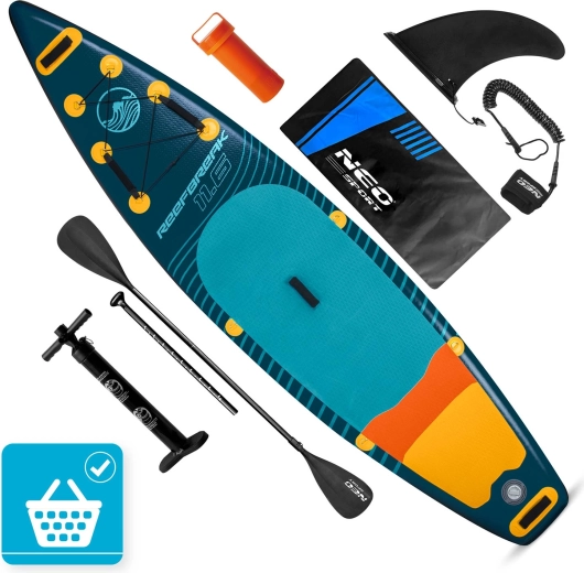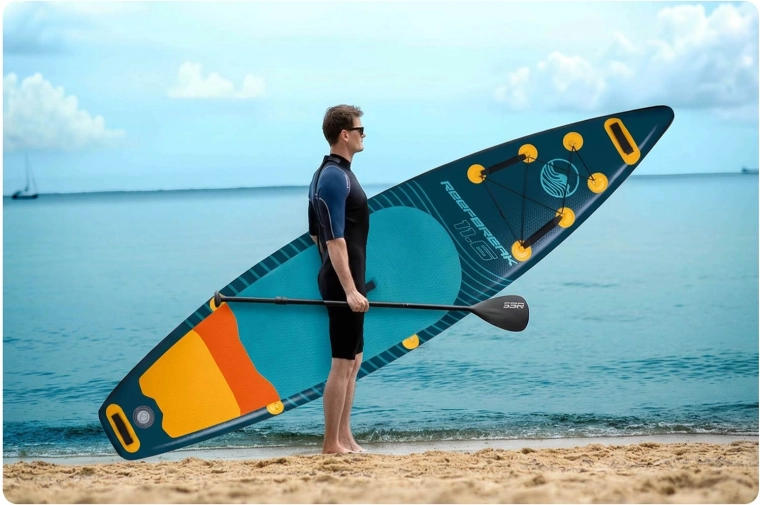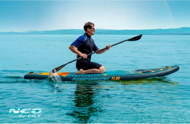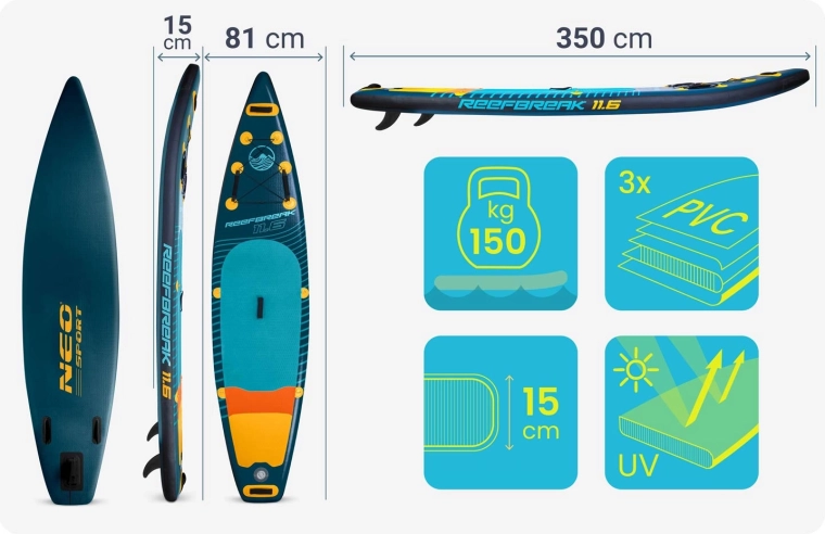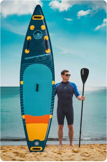 Paddleboard REEFBREAK 11’6 to uniwersalna deska allround/touring na spokojne akweny i mniejsze fale. Dzięki konstrukcji Drop Stitch Light i trójwarstwowemu PVC to lekkie, a jednocześnie wytrzymałe rozwiązanie z powierzchnią odporną na UV oraz wzmocnionymi burtami dla dłuższej żywotności. Szeroka, stabilna platforma z matą trakcyjną EVA daje pewność zarówno początkującym, jak i zaawansowanym.