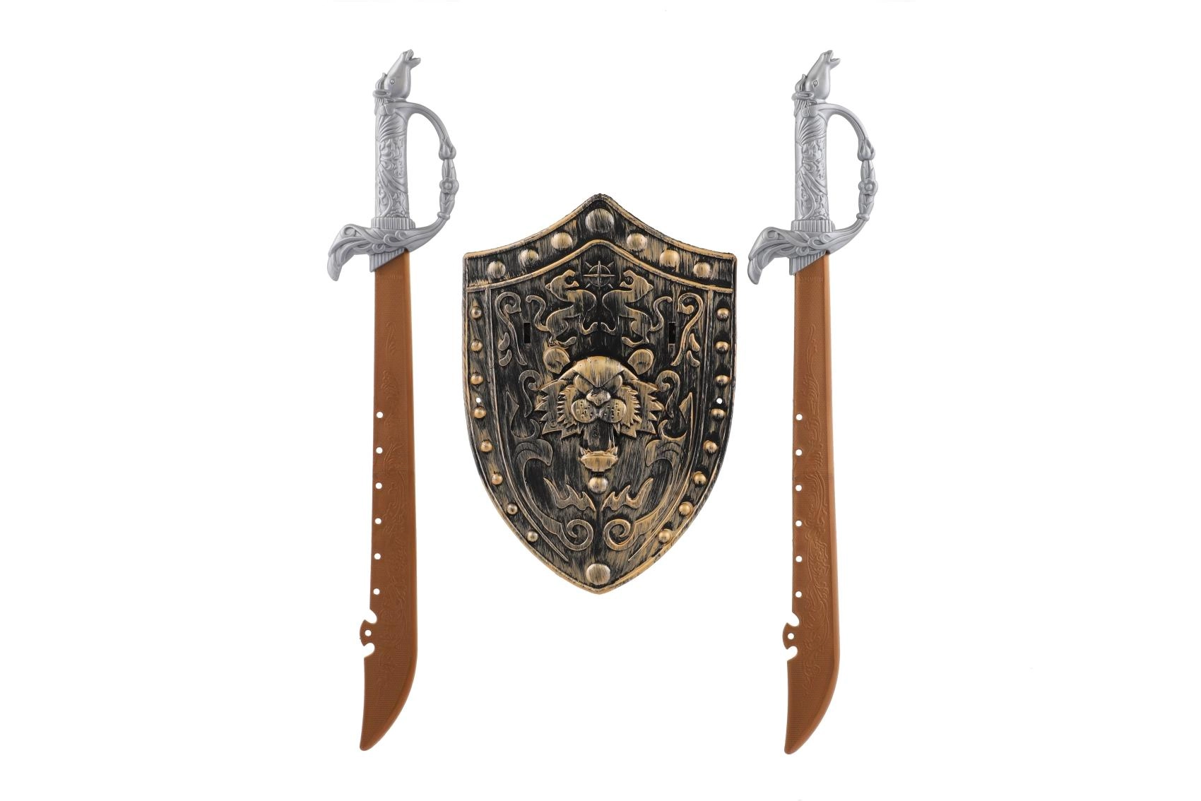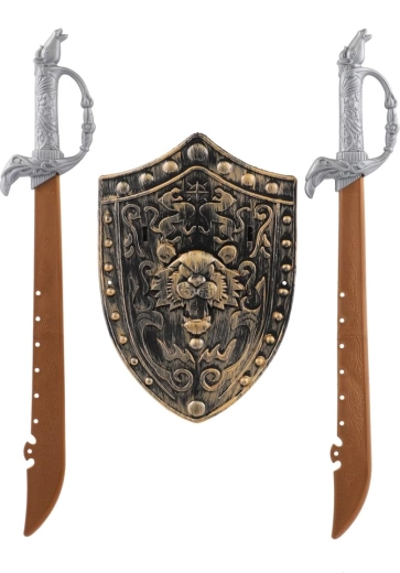 Zostań bohaterem średniowiecznych przygód z tym rycerskim zestawem dla dzieci. Zawiera 2 lekkie plastikowe miecze oraz dekoracyjną tarczę z motywem lwa do bezpiecznej i wciągającej zabawy w rycerzy. Detalicznie wykończone rękojeści i ornamentalny design nadają zabawie autentyczny wygląd, a trwałe i lekkie wykonanie zapewnia wygodny chwyt nawet podczas dłuższych wypraw po przygodę.