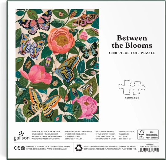 Zanurz się w harmonijnym świecie kwiatów i liści z puzzlami Galison Między kwiatami. Bogata kompozycja pełna roślin, motyli i drobnych stworzeń wyróżnia się subtelnymi barwami i wysoką jakością druku. Specjalne elementy foliowe nadają obrazowi blask, głębię i wyjątkowy efekt wizualny, który pokochasz przy każdym spojrzeniu.