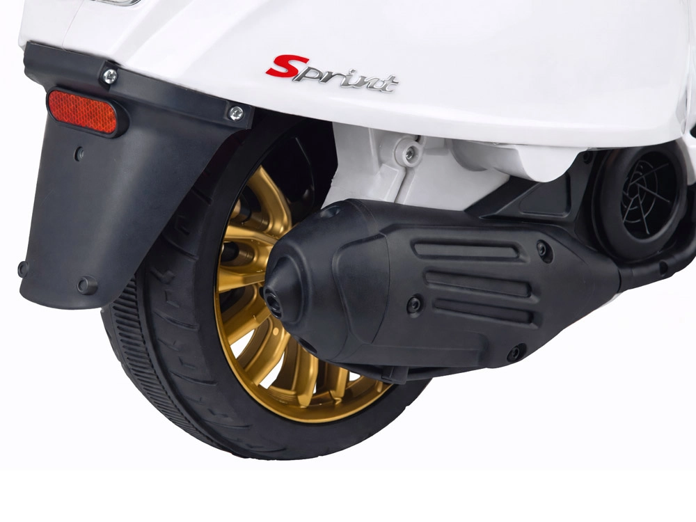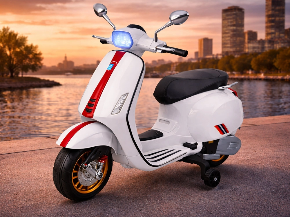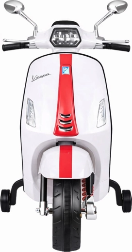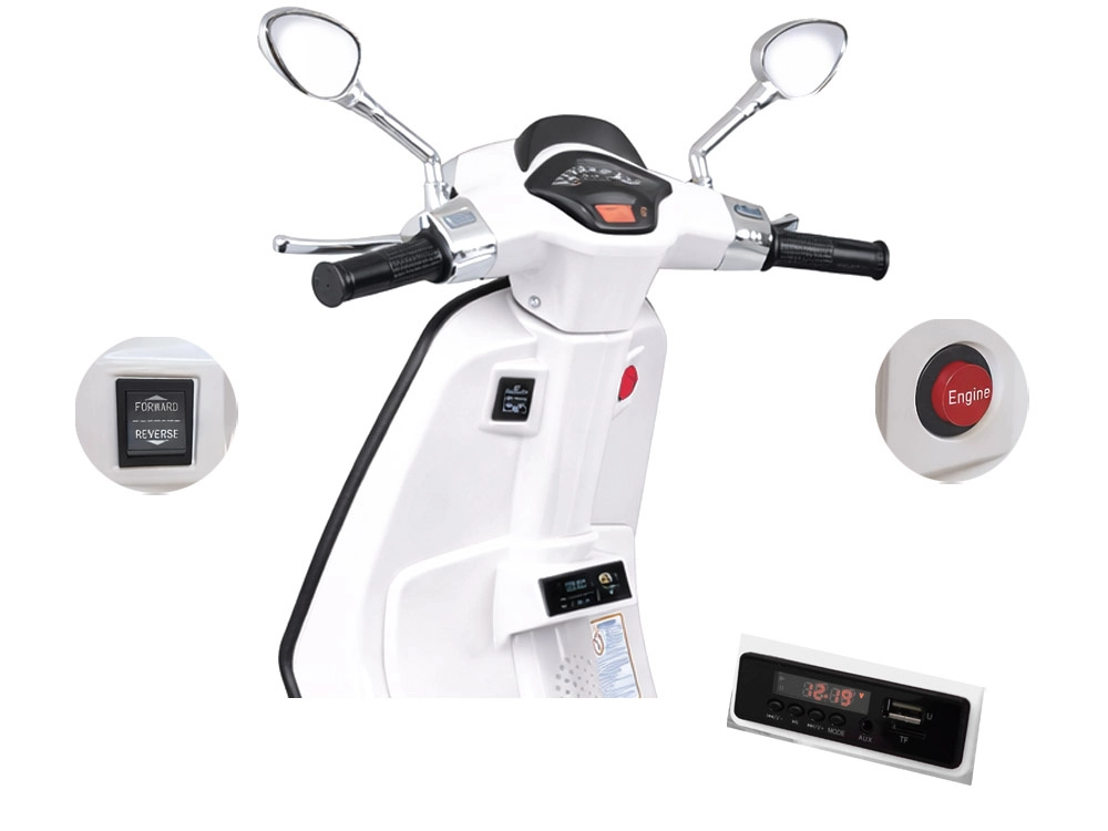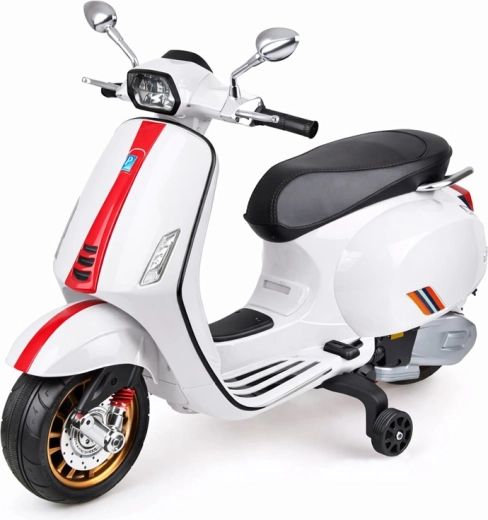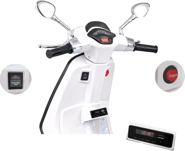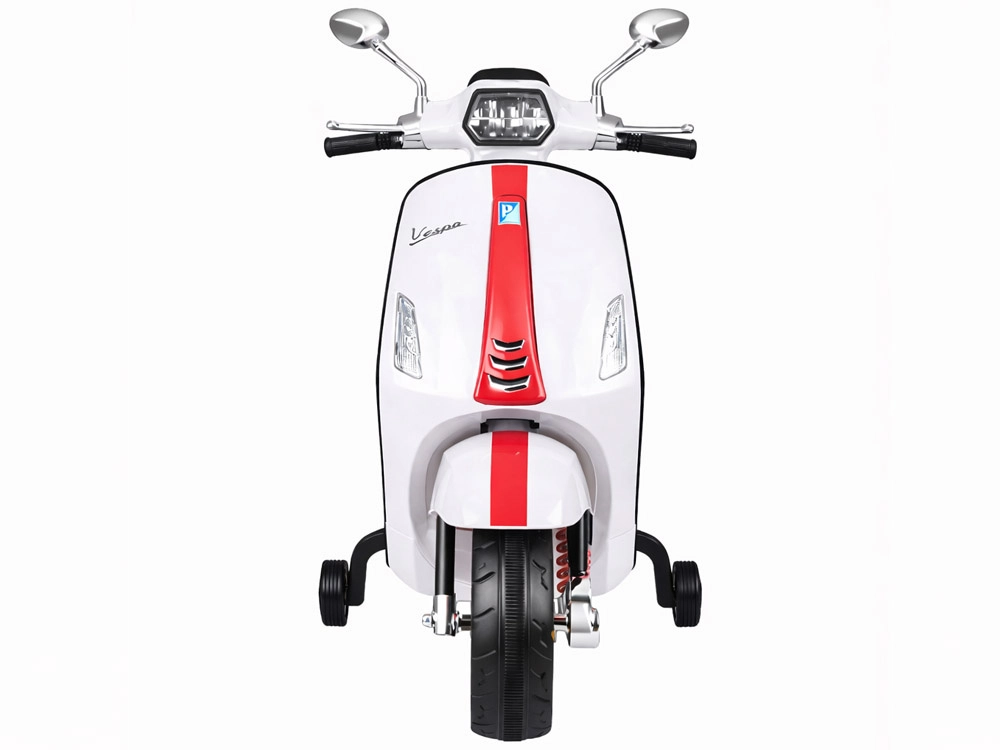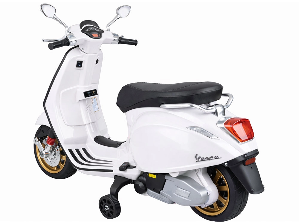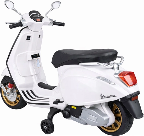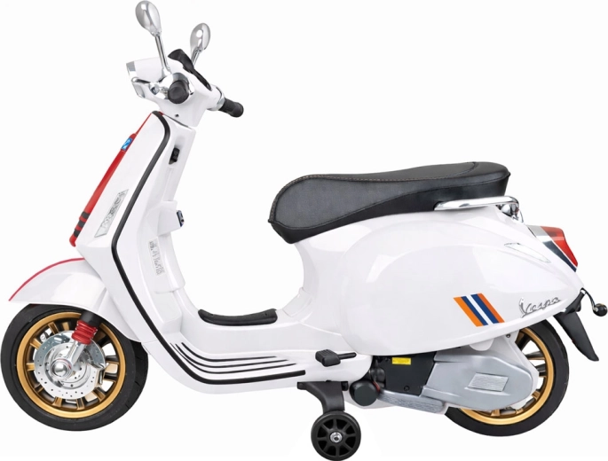 Dziecięcy skuter elektryczny VESPA z melodiami i kółkami pomocniczymi – Biały