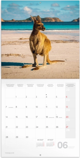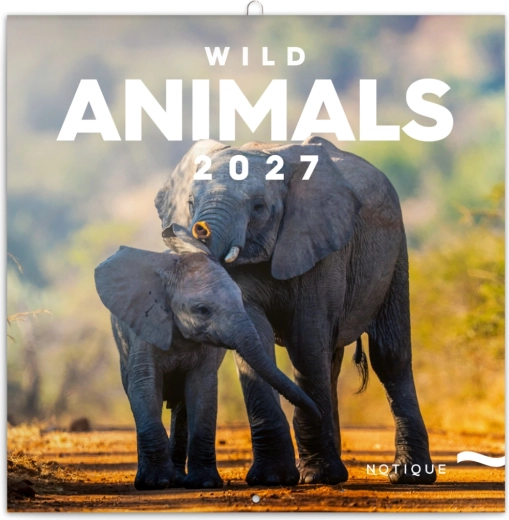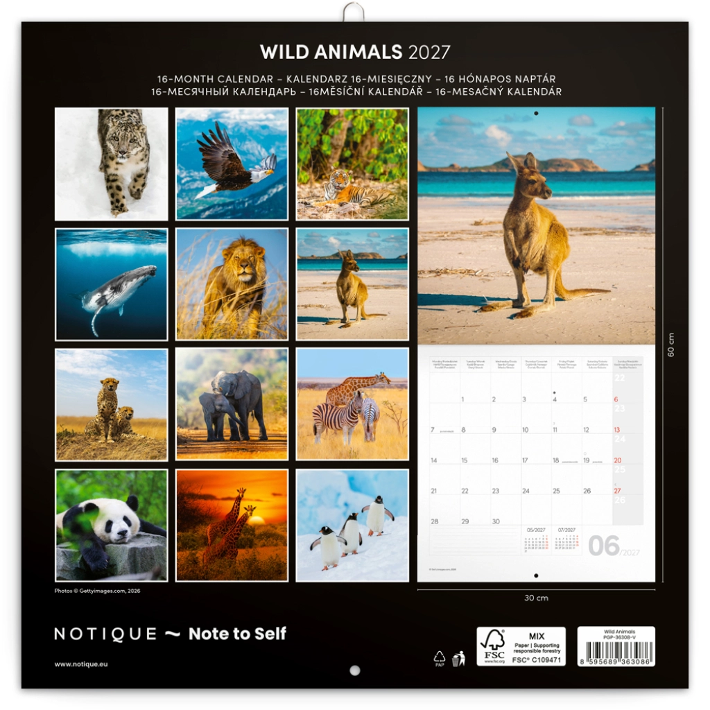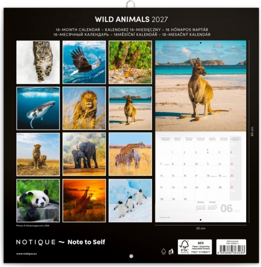 Stylowy ścienny kalendarz notatkowy na rok 2027 z dwunastoma imponującymi fotografiami dzikich zwierząt. Oferuje przejrzyste kalendarium 09/2026–12/2027 w 6 językach, fazy Księżyca, ważne święta oraz dużo miejsca na notatki każdego dnia.