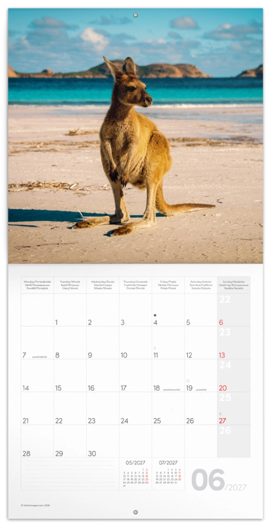 Każdy miesiąc zdobi unikalne ujęcie ikonicznych zwierząt – od majestatycznego orła po zwinnego irbisa śnieżnego. Kalendarz jest nie tylko praktyczny, lecz także dekoracyjny.