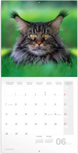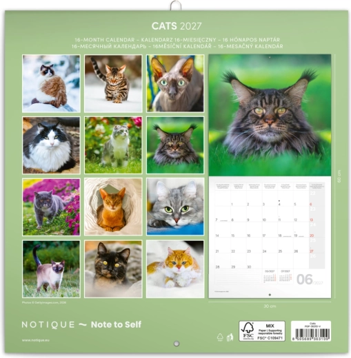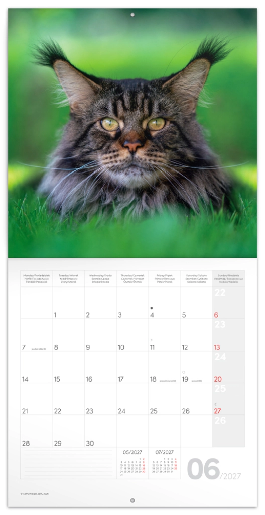 Odkryj radość planowania z kalendarzem pełnym zachwycających fotografii kotów. Każdy miesiąc przynosi nowe zdjęcie oraz czytelne pola na Twoje plany, zadania i rodzinne notatki. Dzięki przejrzystemu układowi łatwo odnajdziesz się w terminach przez cały rok 2027.