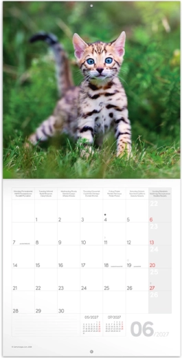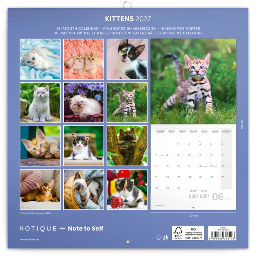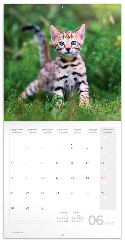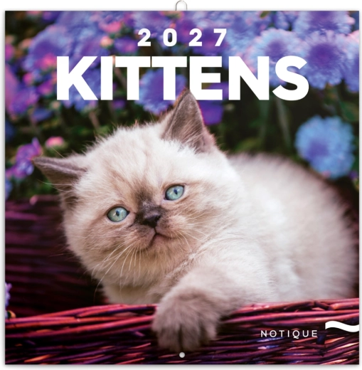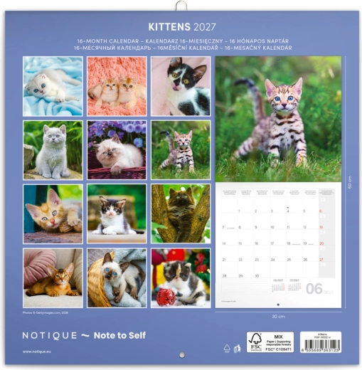 Uroczy notatkowy kalendarz ścienny z motywami figlarnych kociąt na rok 2027 w formacie 30 × 30 cm. Oferuje czytelne kalendarium od września 2026 do grudnia 2027 w sześciu językach, zawiera fazy Księżyca, ważne święta oraz dużo miejsca na notatki na każdy dzień.