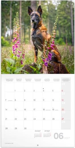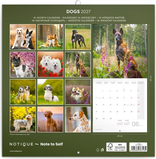 Stylowy kalendarz notatkowy z motywem psów na rok 2027 w praktycznym formacie 30 × 30 cm. Oferuje przejrzyste kalendarium od września 2026 do grudnia 2027 w 6 językach, przegląd faz księżyca, ważne święta oraz dużo miejsca na notatki przy każdym dniu.