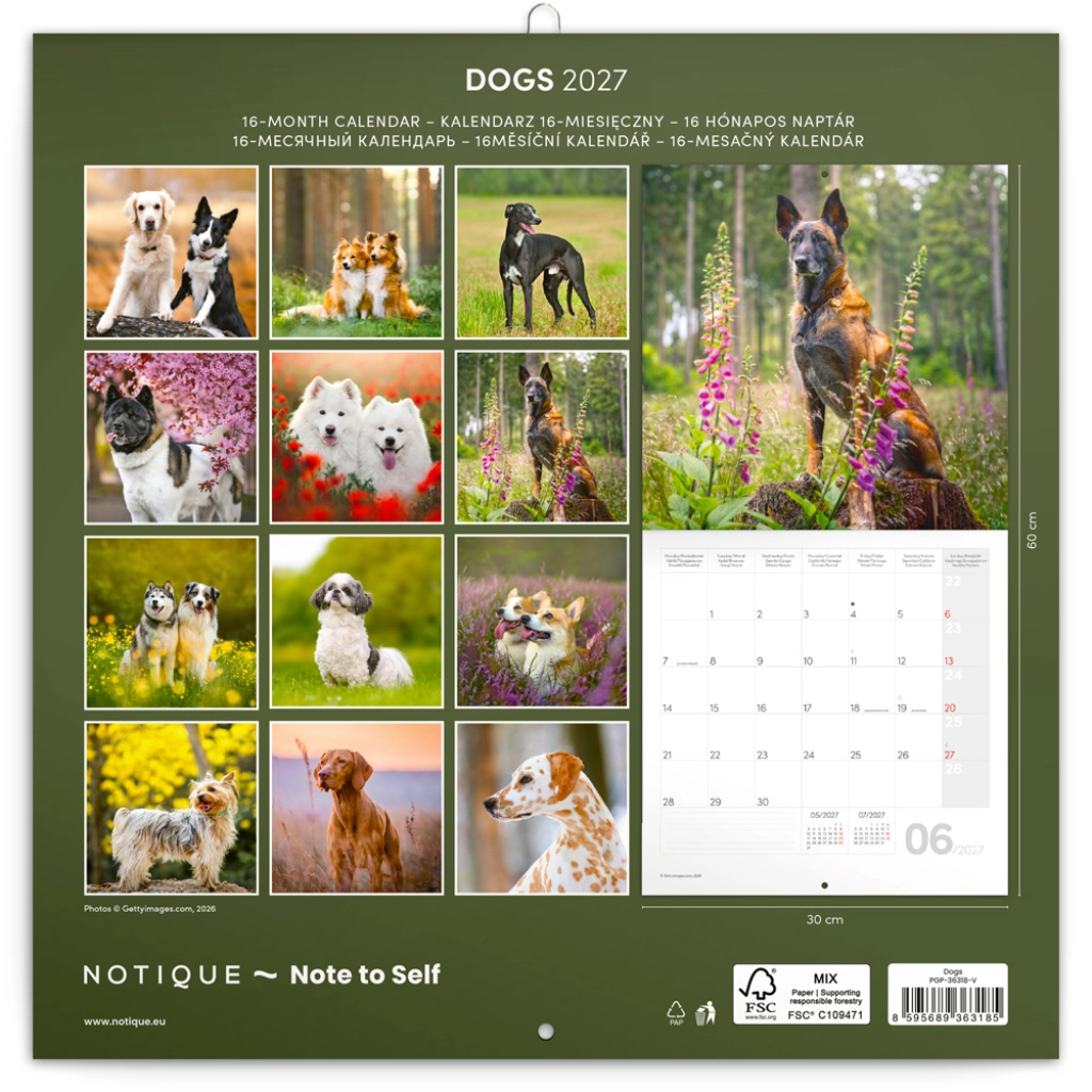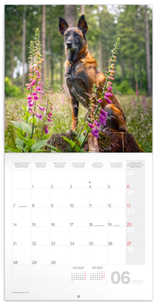 Kalendarz jest wielojęzyczny (6 języków), zawiera fazy Księżyca oraz zaznaczone ważne święta. Dzięki dużym polom dziennym zyskasz mnóstwo miejsca na notatki, spotkania, wydarzenia rodzinne i plany weekendowe. Idealny prezent dla miłośników psów i praktyczny dodatek do domu.