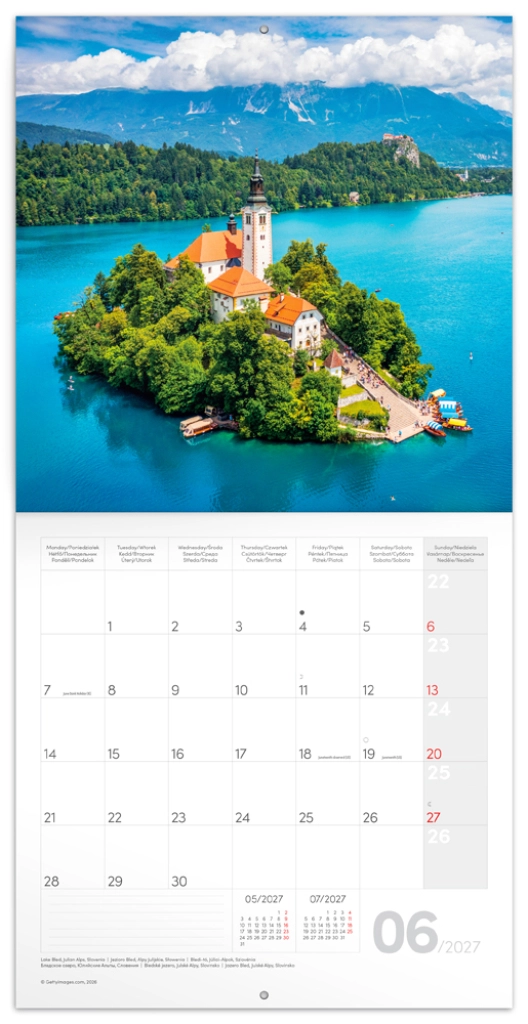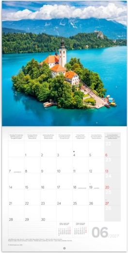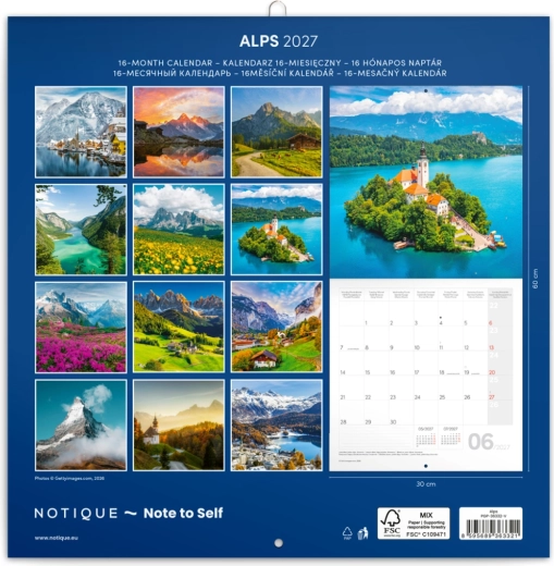 Odkrywaj piękno Alp w każdym miesiącu ze ściennym kalendarzem notatkowym Notique na rok 2027 w formacie 30 × 30 cm. Oferuje 12 najwyższej jakości fotografii, przejrzyste kalendarium 9/2026–12/2027 w sześciu językach, fazy księżyca, ważne święta oraz dużo miejsca na notatki na każdy dzień.