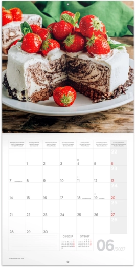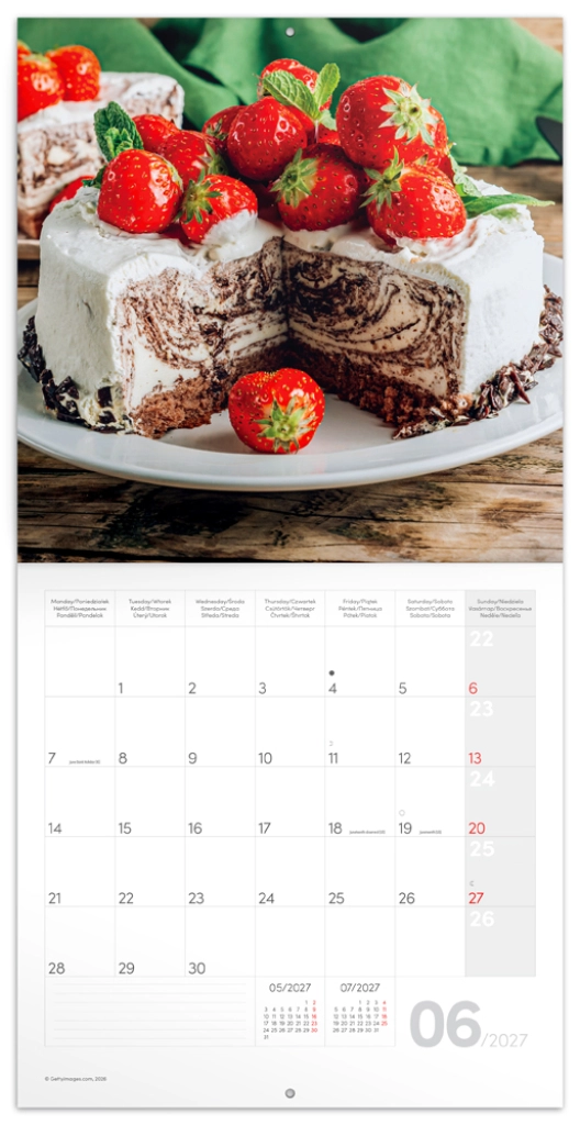 Każda strona kalendarza zachwyca detalicznym zdjęciem tortu lub deseru – od czekoladowych po owocowe specjały.