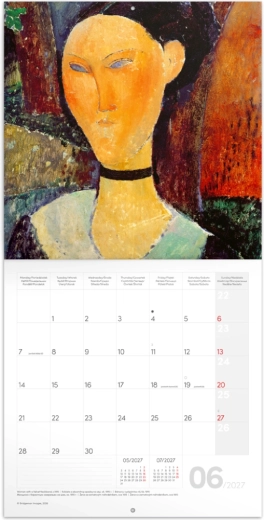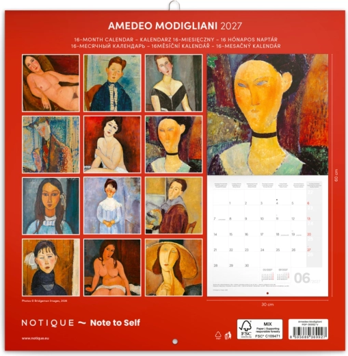 Stylowy notesowy kalendarz z wyborem obrazów mistrza sztuki nowoczesnej AMEDEO MODIGLIANI ucieszy miłośników sztuki i uporządkowanych planerów. Oferuje przejrzyste kalendarium 09/2026–12/2027 w sześciu językach, fazy księżyca, ważne święta oraz dużo miejsca na codzienne notatki. Idealny format 30 × 30 cm do biura i domu.