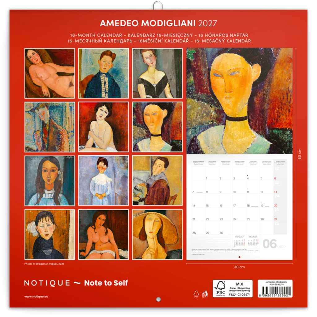 Odkrywaj co miesiąc inny świat AMEDEA MODIGLIANIEGO. Ten elegancki ścienny kalendarz notesowy łączy sztukę i praktyczność: przejrzysty układ, miejsce na zapiski oraz przydatne informacje do planowania przez cały rok 2027 (z wyprzedzeniem już od września 2026).