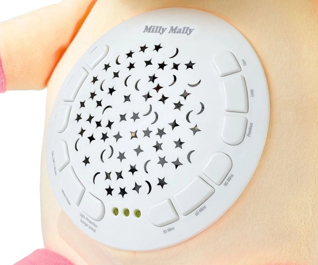 10 kołysanek i 5 rodzajów białego szumu (szum wody z ptaszkami, bicie serca, kropelki, śpiew ptaków, deszcz) pomaga maluszkowi się wyciszyć i zasnąć.