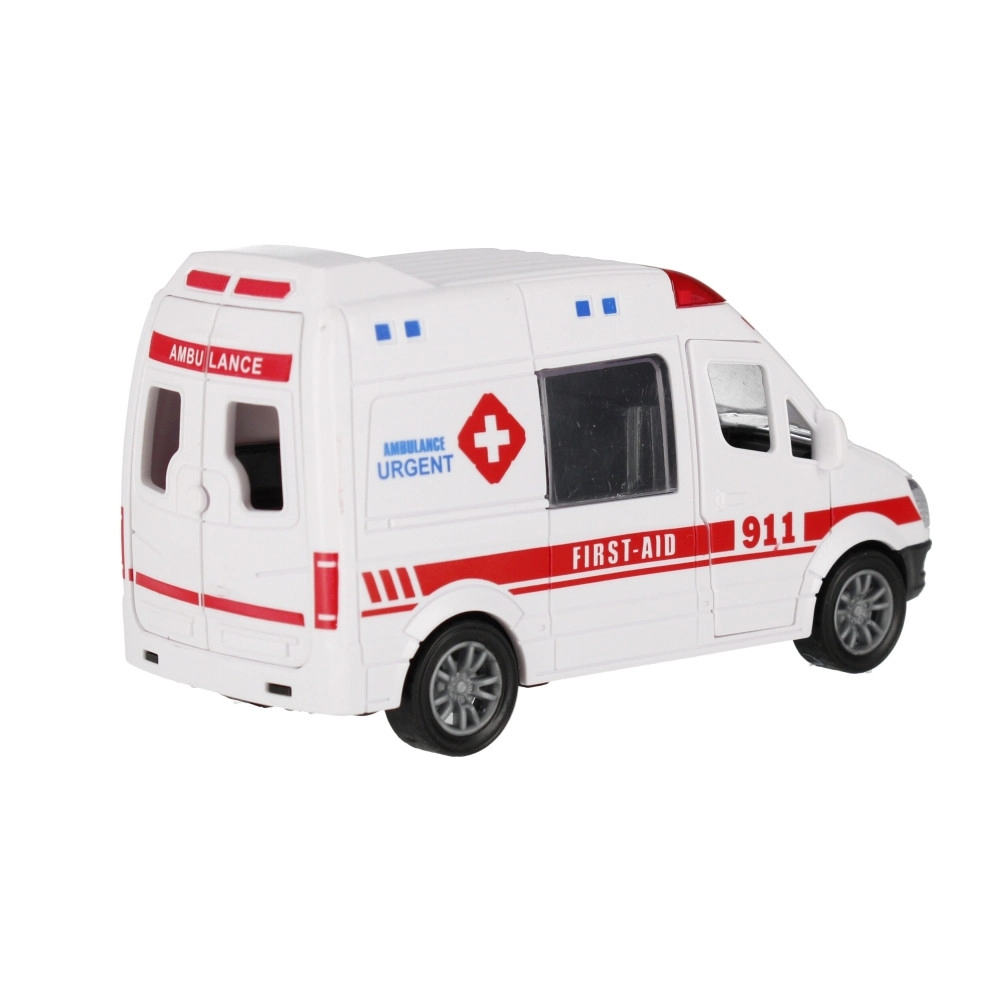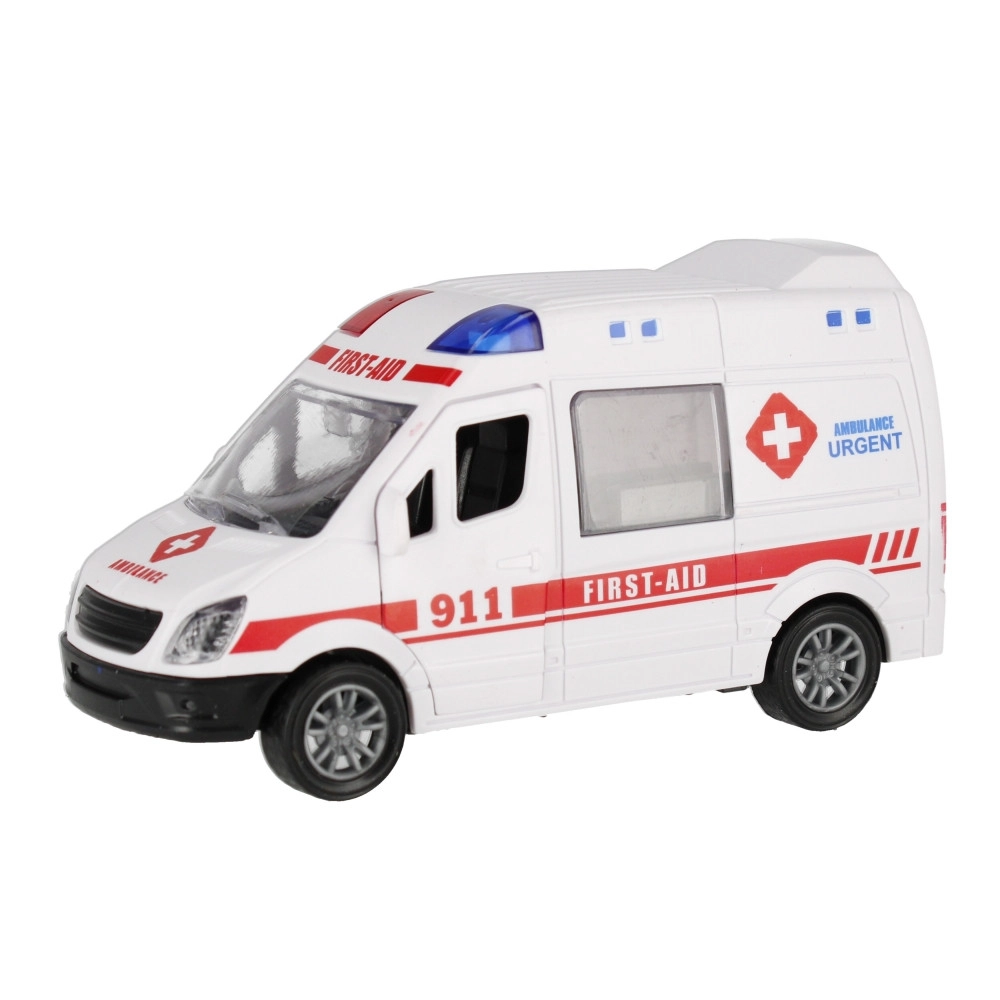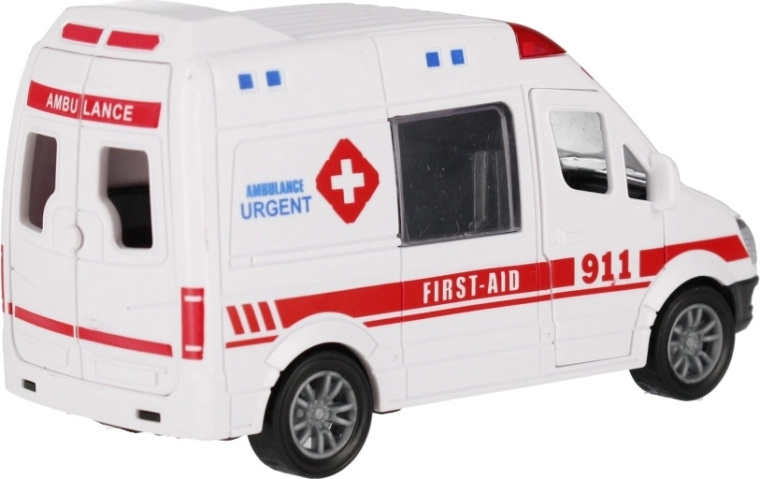 Biały pojazd służb ratunkowych z czerwonymi nadrukami FIRST-AID i 911. Idealny do odgrywania scenek z pierwszą pomocą i transportem pacjentów.