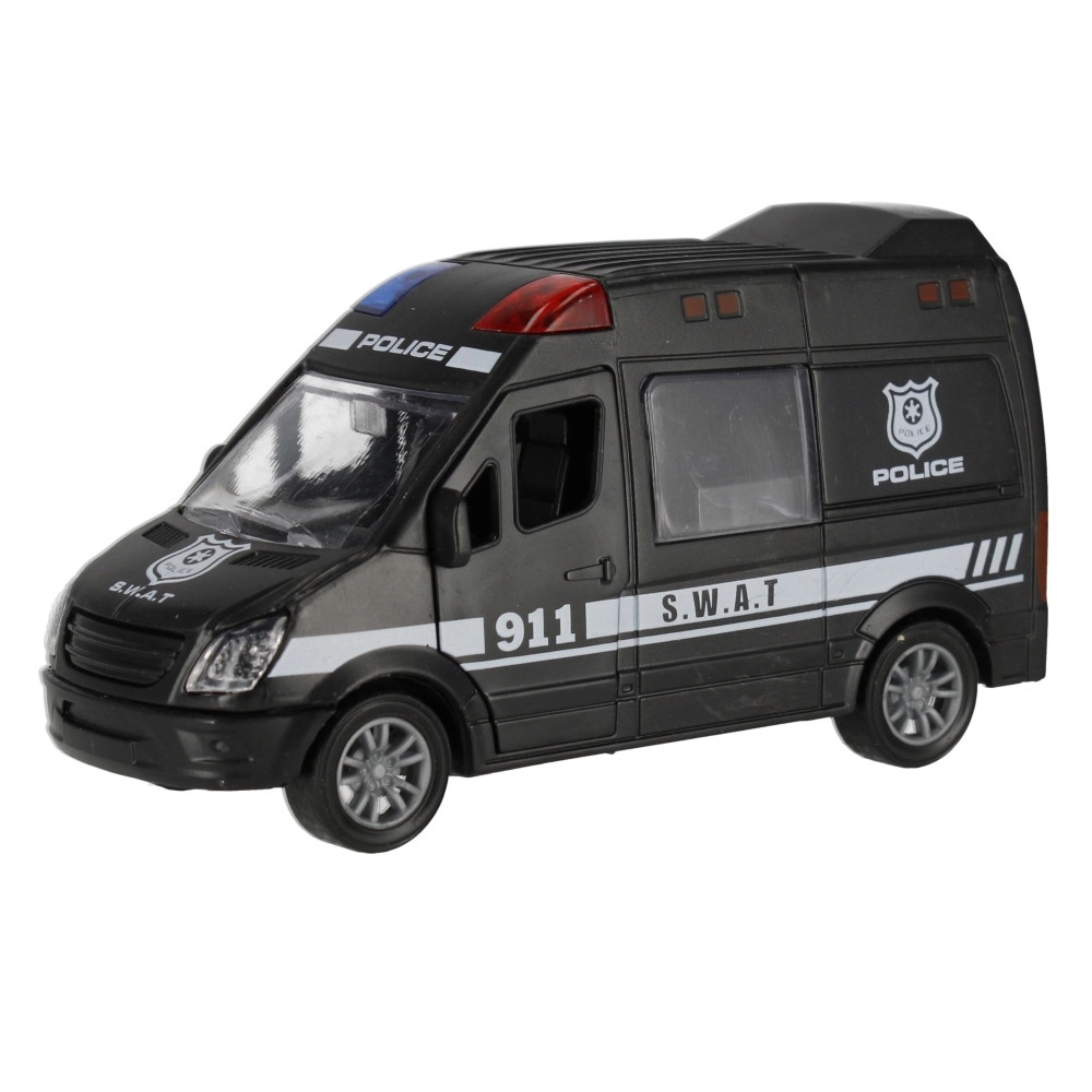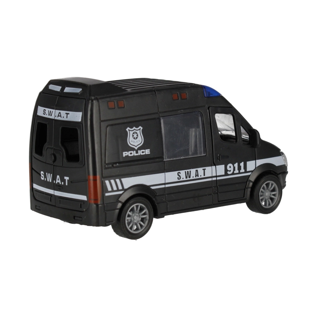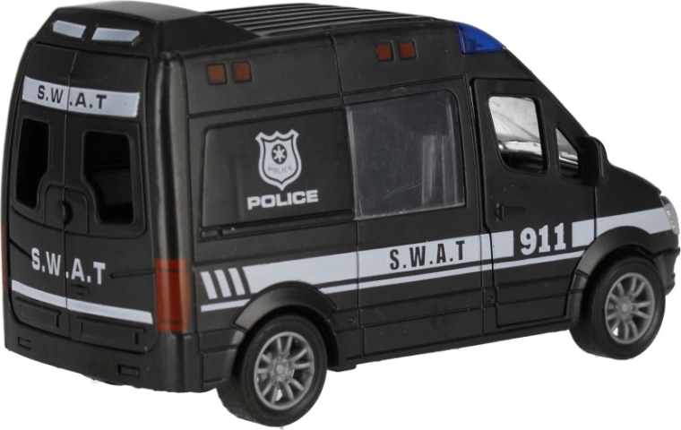Czarny van z napisami POLICE i 911, belką świetlną oraz realistycznymi detalami pobudza do tworzenia pełnych emocji scenariuszy interwencji. Świetny wybór dla małych stróżów prawa.