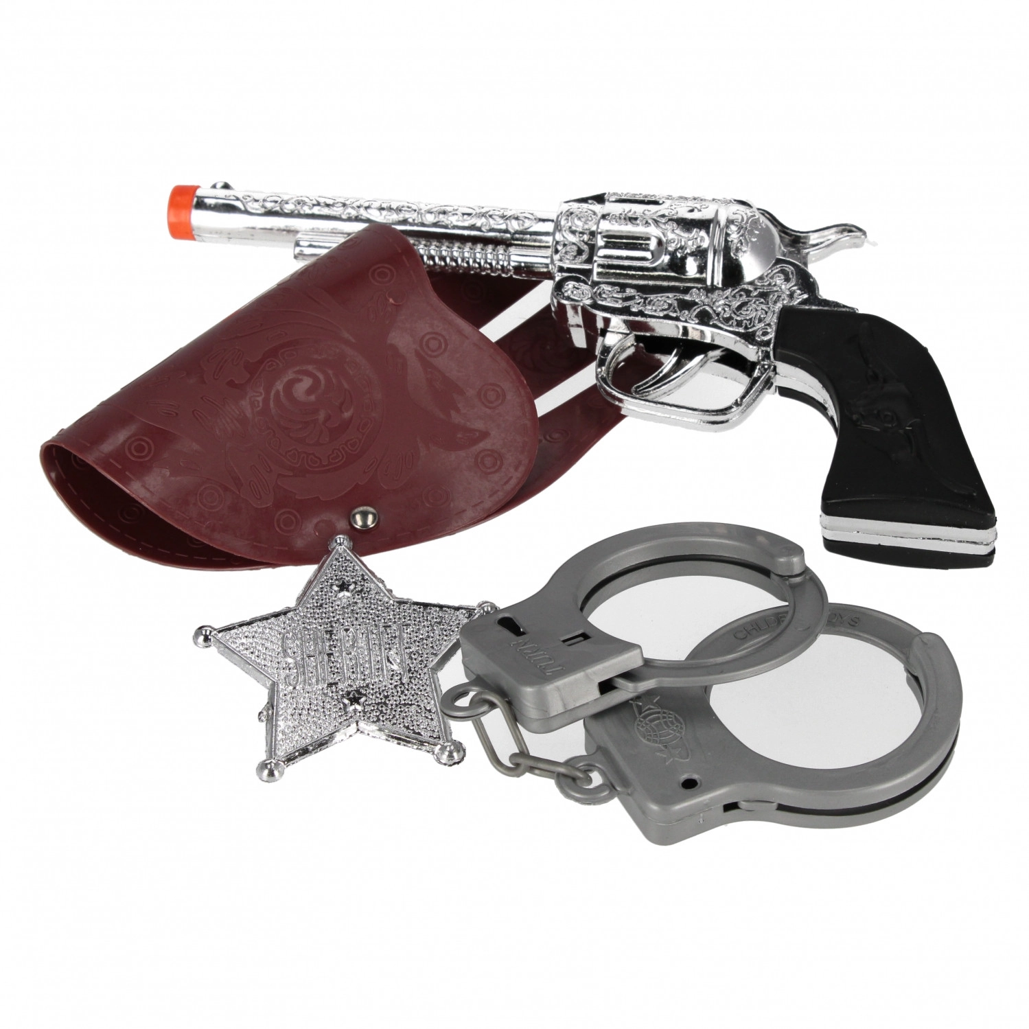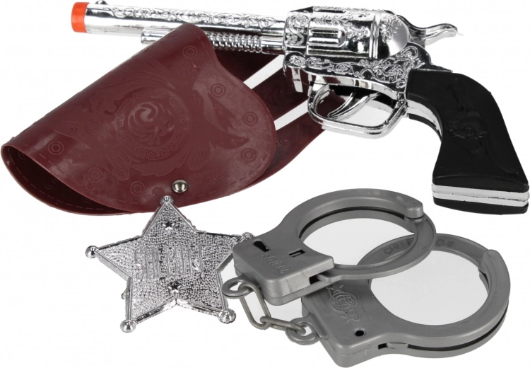 - Kompletny zestaw: zabawkowa broń, odznaka szeryfa i kajdanki