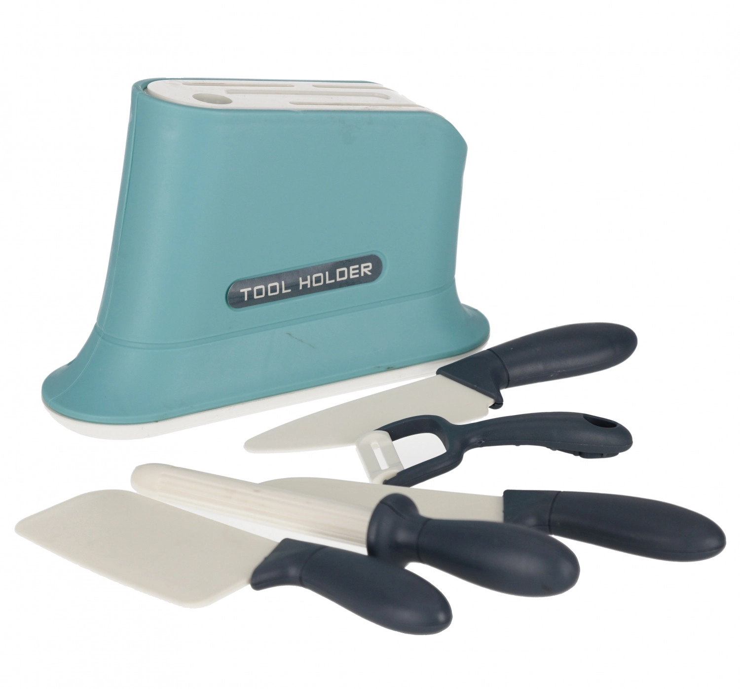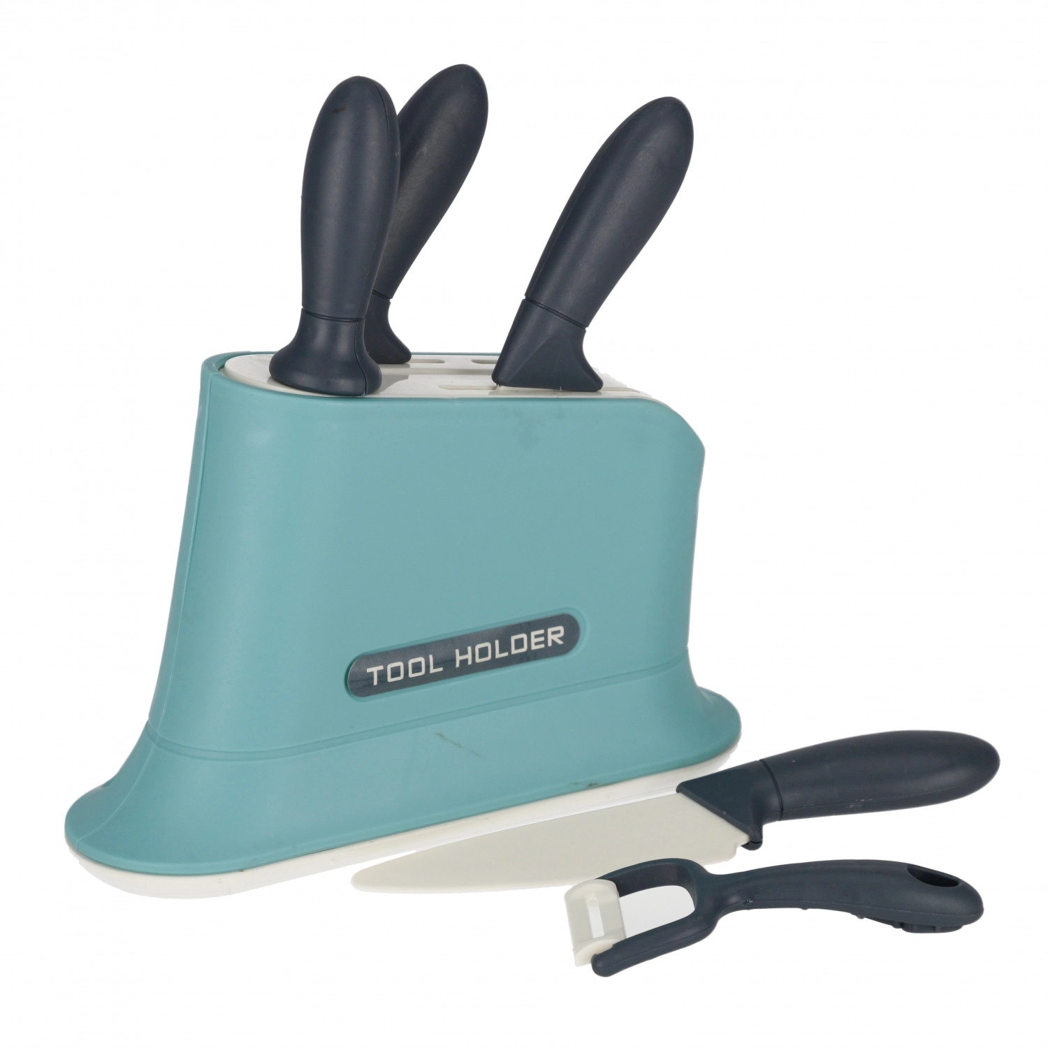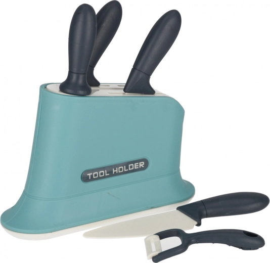Bezpieczny zestaw treningowy dla małych kucharzy: stojak na narzędzia, kilka noży oraz obieraczka z ergonomicznymi rękojeściami dla wygodnego chwytu.