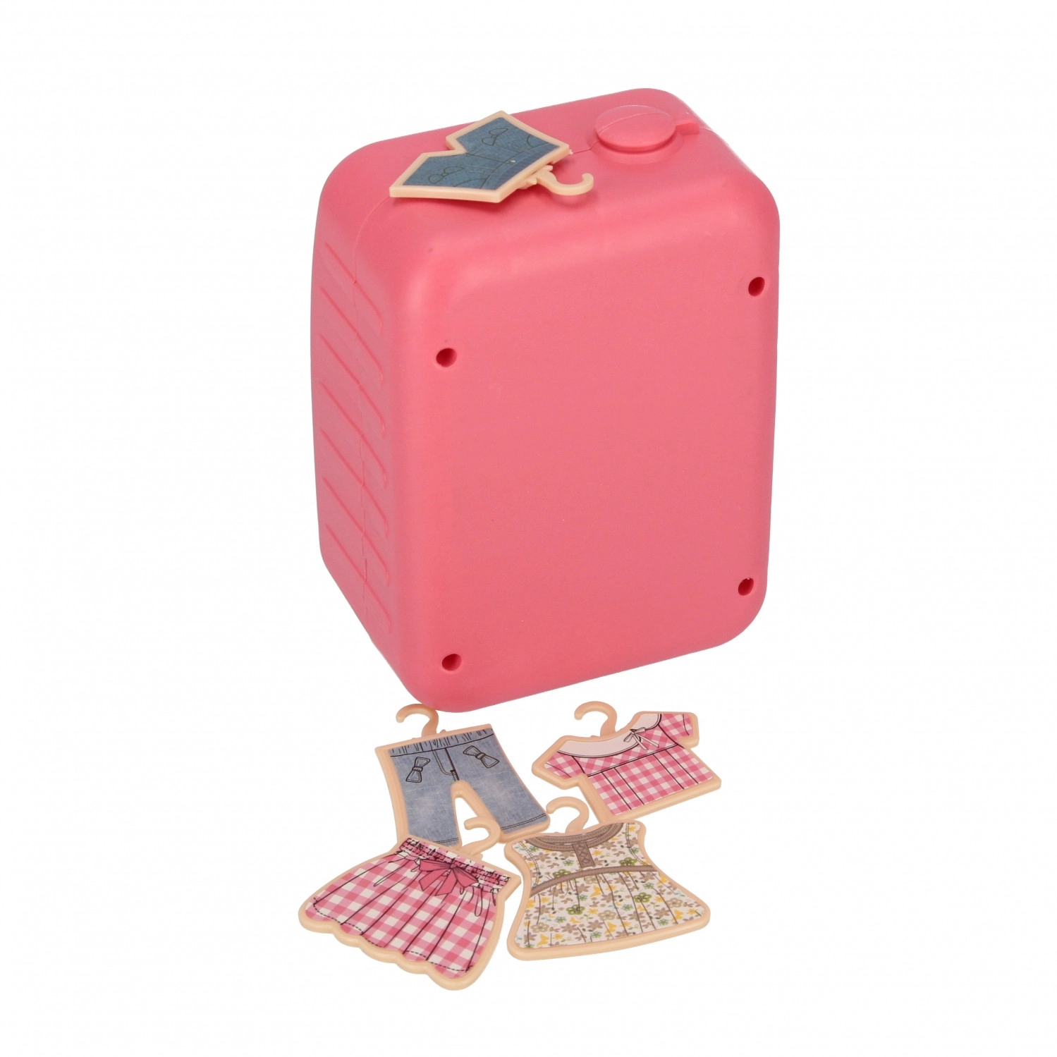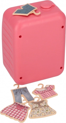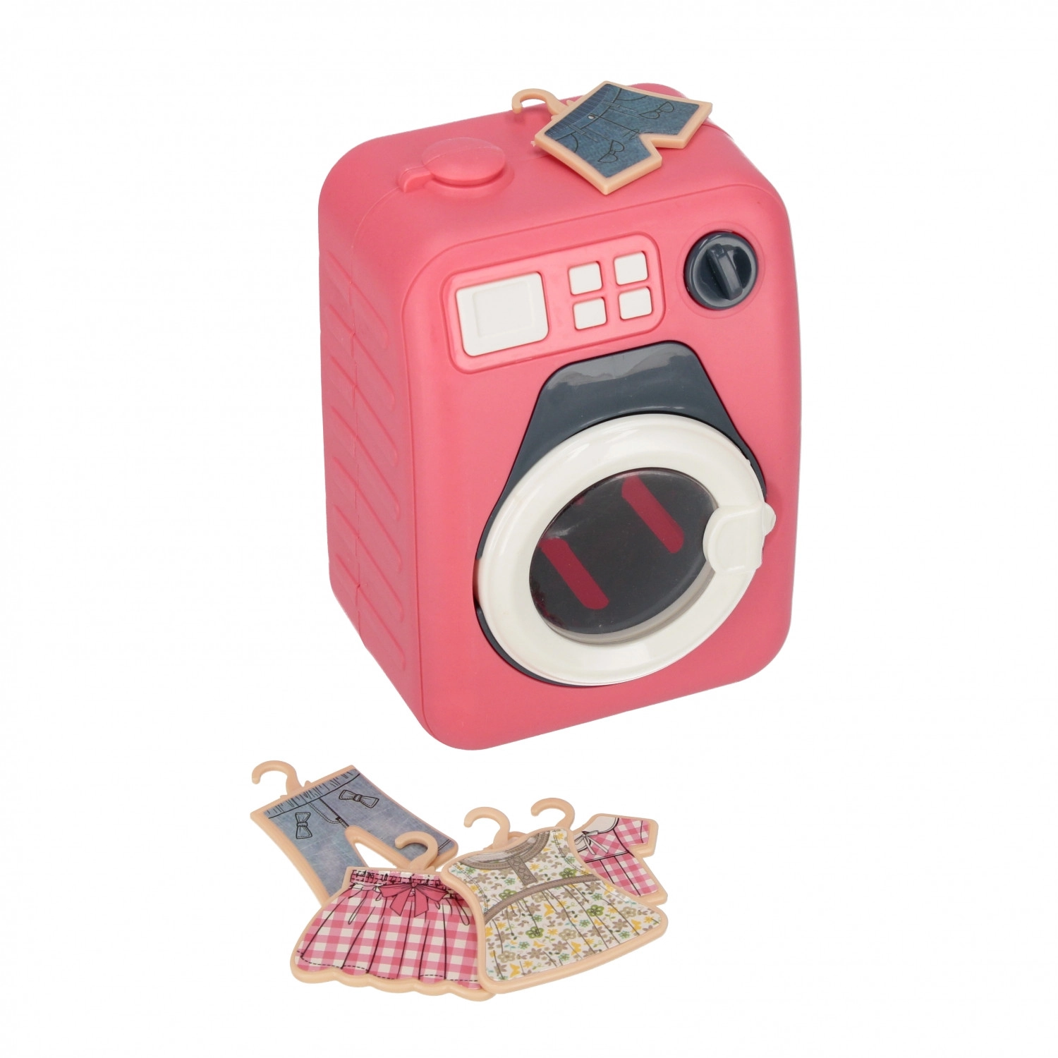 Różowa pralka ładowana od przodu z przezroczystymi drzwiczkami i panelem sterowania. W zestawie 5× wieszaków z ubrankami – dzieci mogą „prać”, wieszać i sortować pranie.