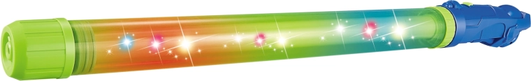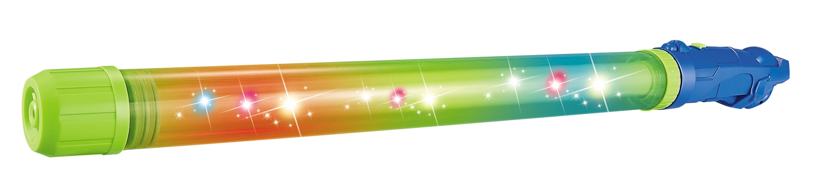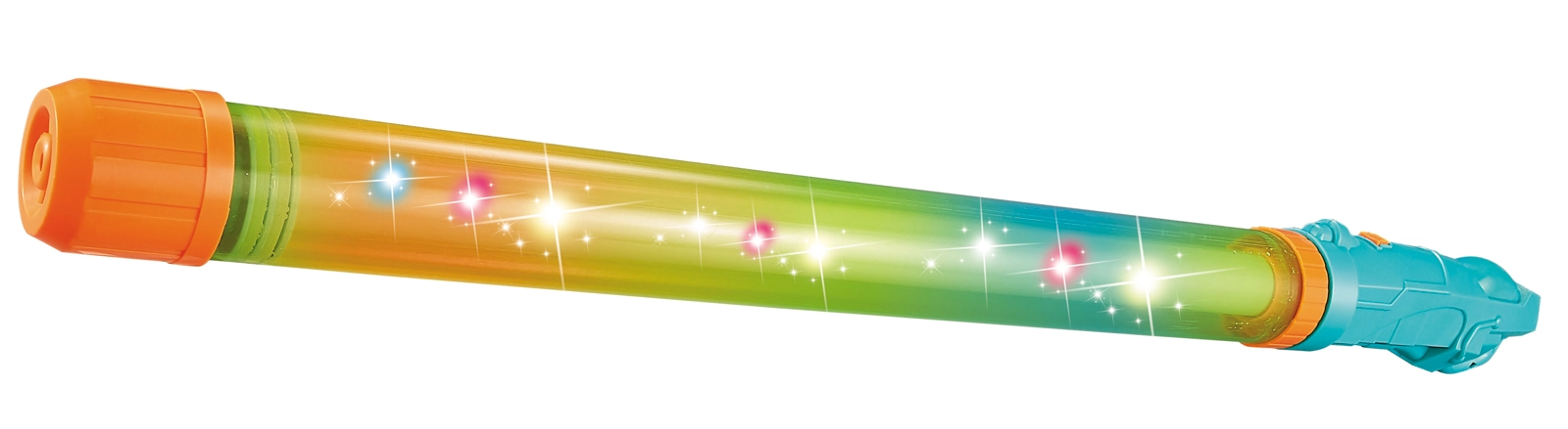 Po naciśnięciu przycisku przezroczyste korpus pistoletu rozświetla się kolorowymi światłami. Dzieci mogą cieszyć się dynamicznym widowiskiem także w gorszych warunkach oświetleniowych.