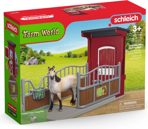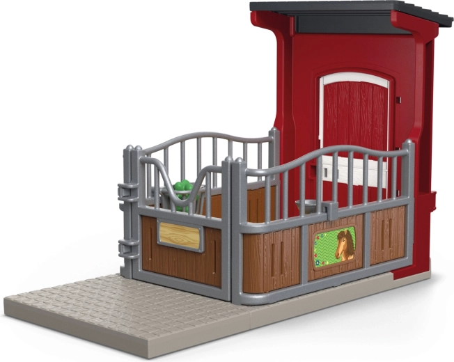 Stylowy czerwony boks oferuje klaczy mustanga przytulne schronienie po długim dniu. Znajdziesz w nim podłogę ze słomą, metalowy żłób na karmę z zielonymi jabłkami oraz miskę z wodą. Drzwiczki otwierają się, co ułatwia umieszczanie konia i odgrywanie scenek. Na przedniej tabliczce można dopisać własne imię – wystarczy wybrać!