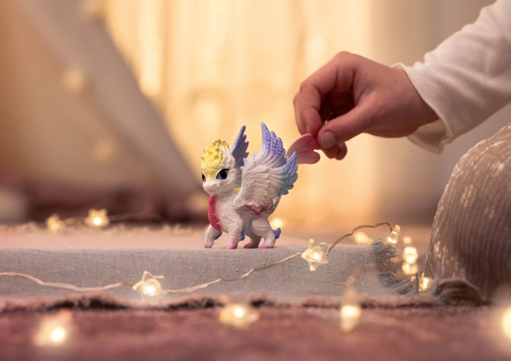 Odkryj magię świata BAYALA z uroczym tęczowym smoczkiem, który kocha słońce i deszcz – właśnie te chwile, gdy na niebie rodzi się tęcza. Figurka zachwyca precyzyjnym, ręcznym malowaniem, wyrazistymi fioletowymi oczami i lśniącymi skrzydłami, które wyglądają, jakby miały za moment wzbić się w powietrze.